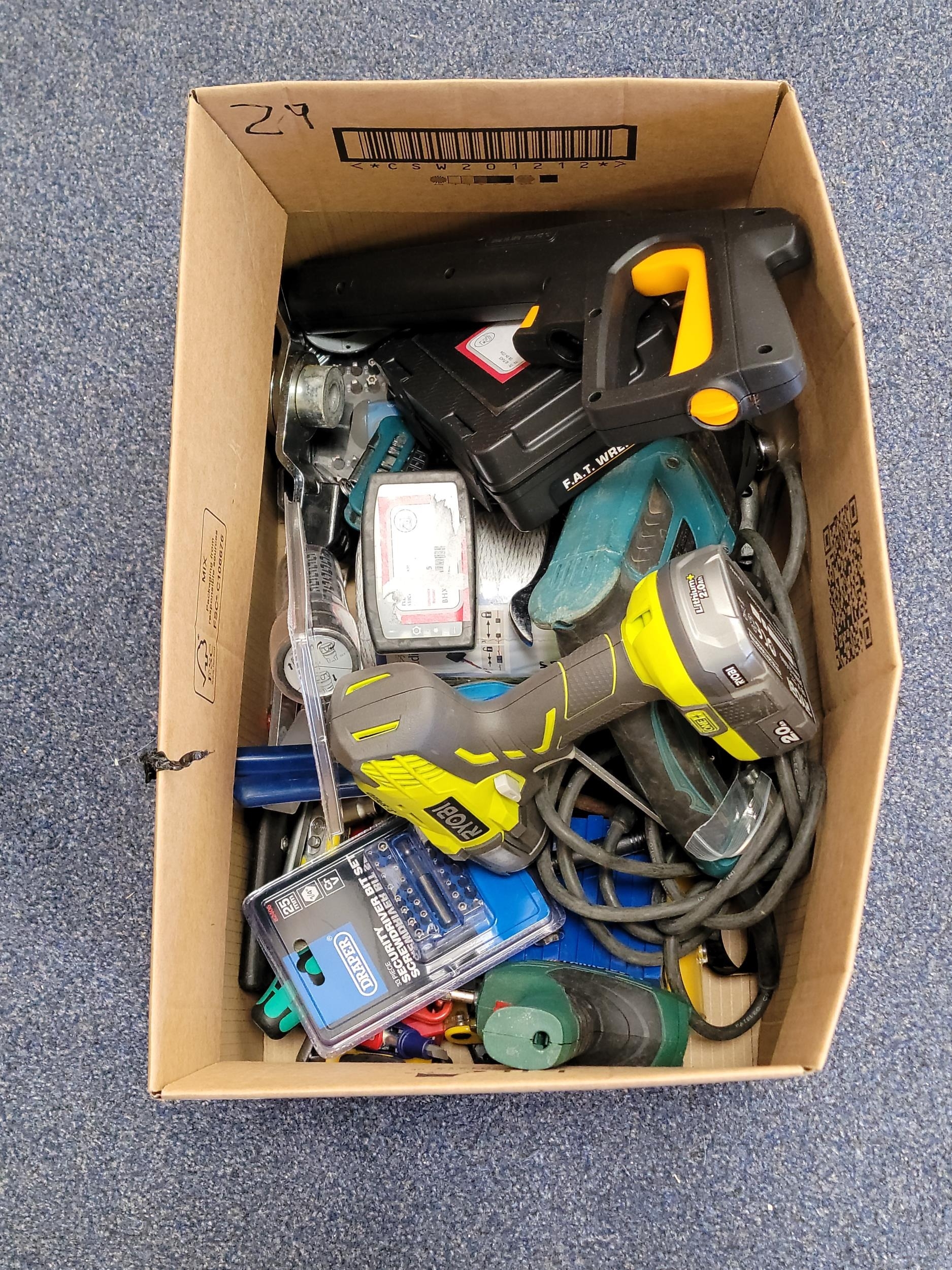 including: Power and hand tools, a Ryobi drill with battery, a boxed torque screwdriver, a Makita hammer drill, etc.