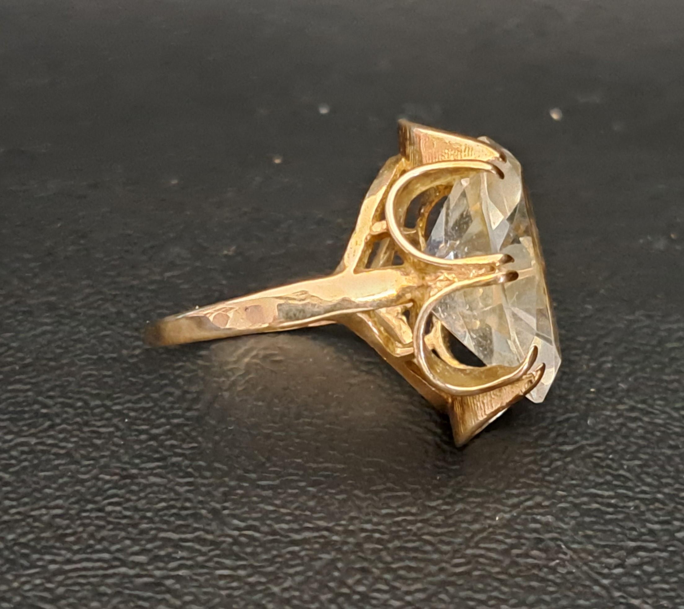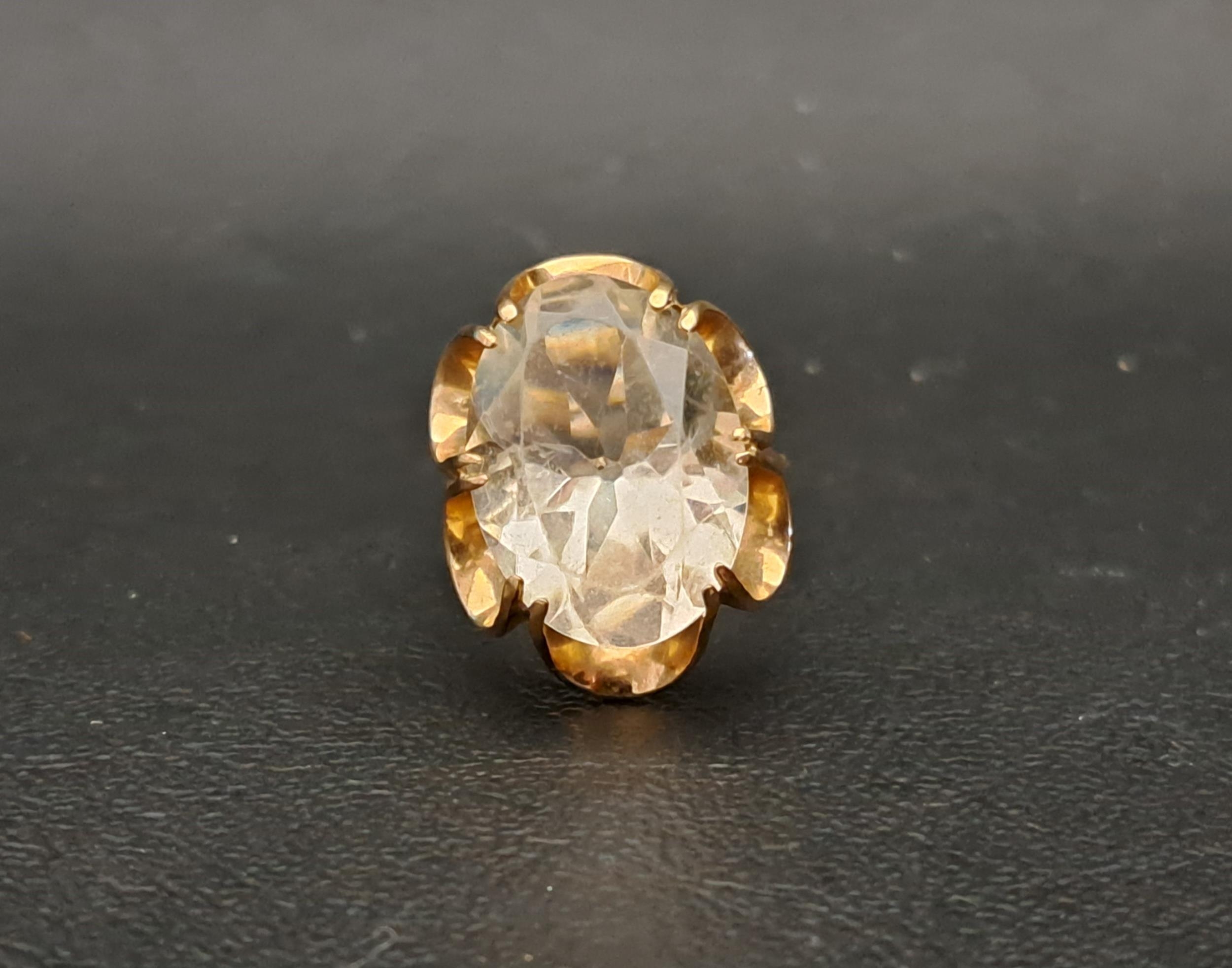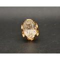 the large oval cut citrine measuring 17.6 x 12.7 x 8.4mm, on unmarked gold shank with pierced shaped setting, ring size O and approximately 5.1 grams