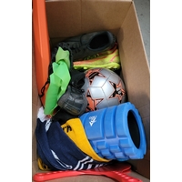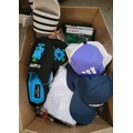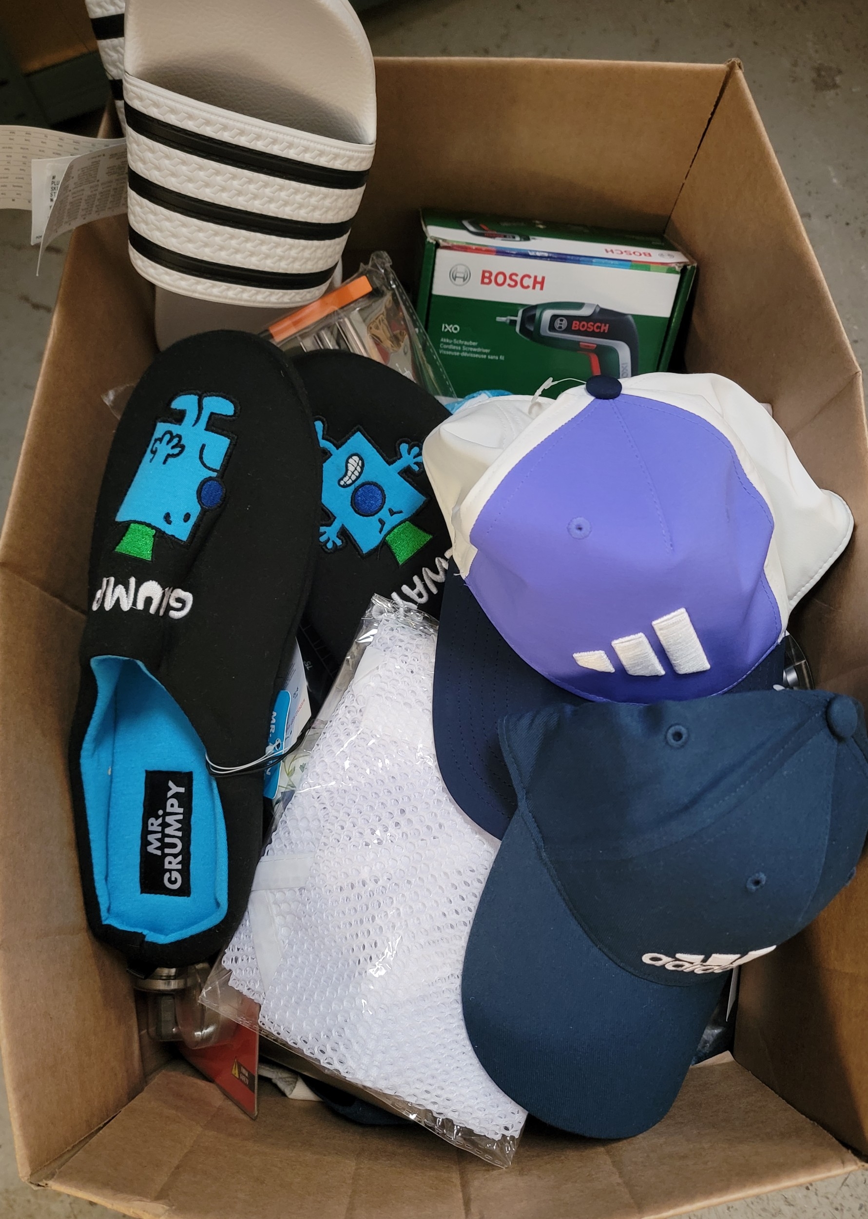 ONE BOX OF NEW ITEMSincluding white Adidas slides - Size UK 8, Slippers, souvenirs, brake piston tool, etc.