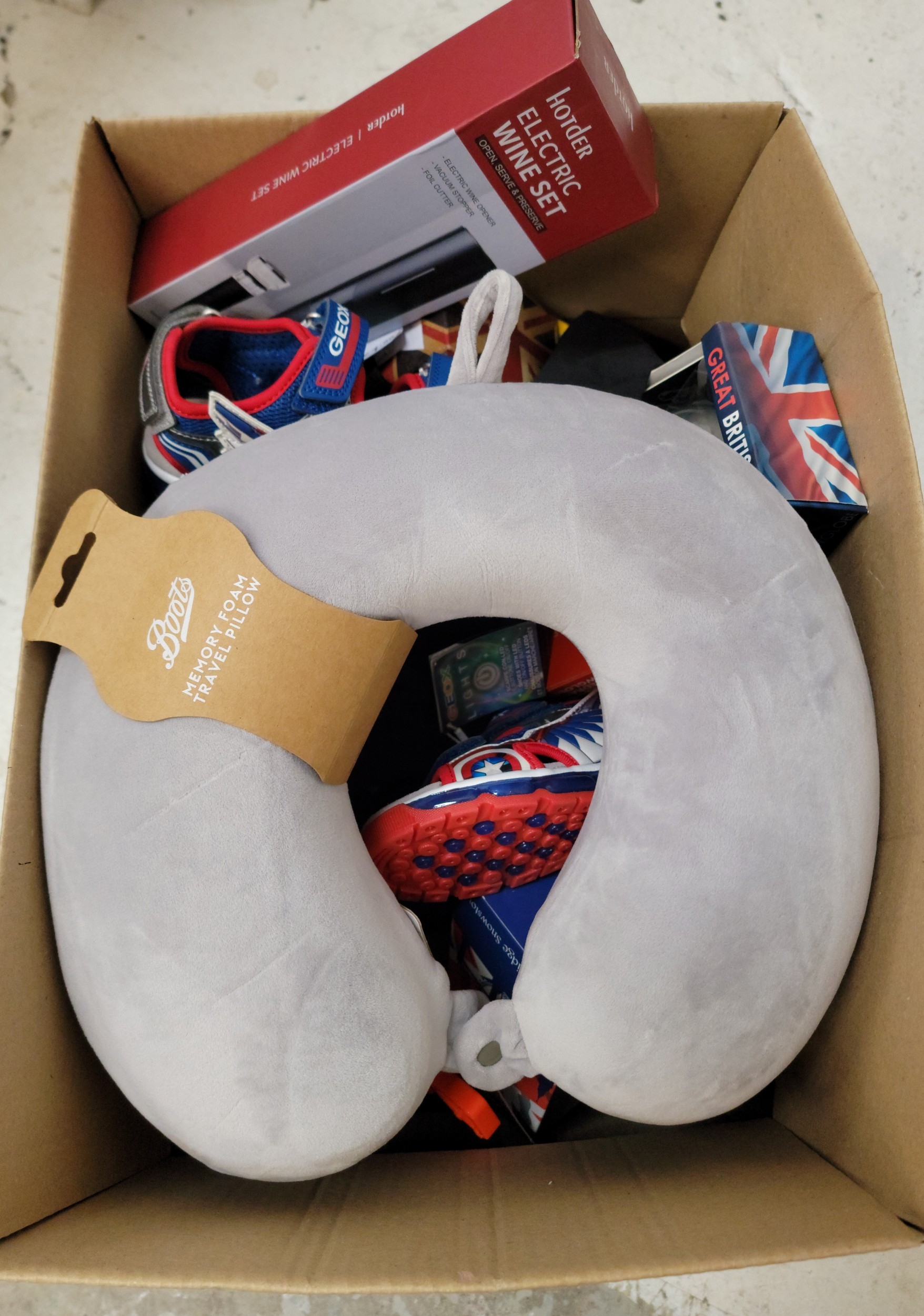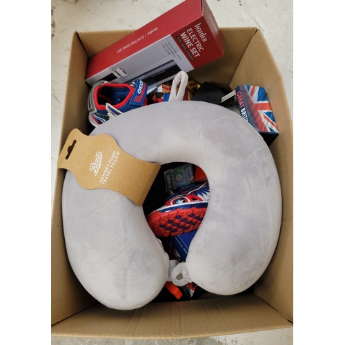 ONE BOX OF NEW ITEMS including an electric bottle opener, clothing, souvenirs and kids shoes, etc.