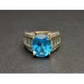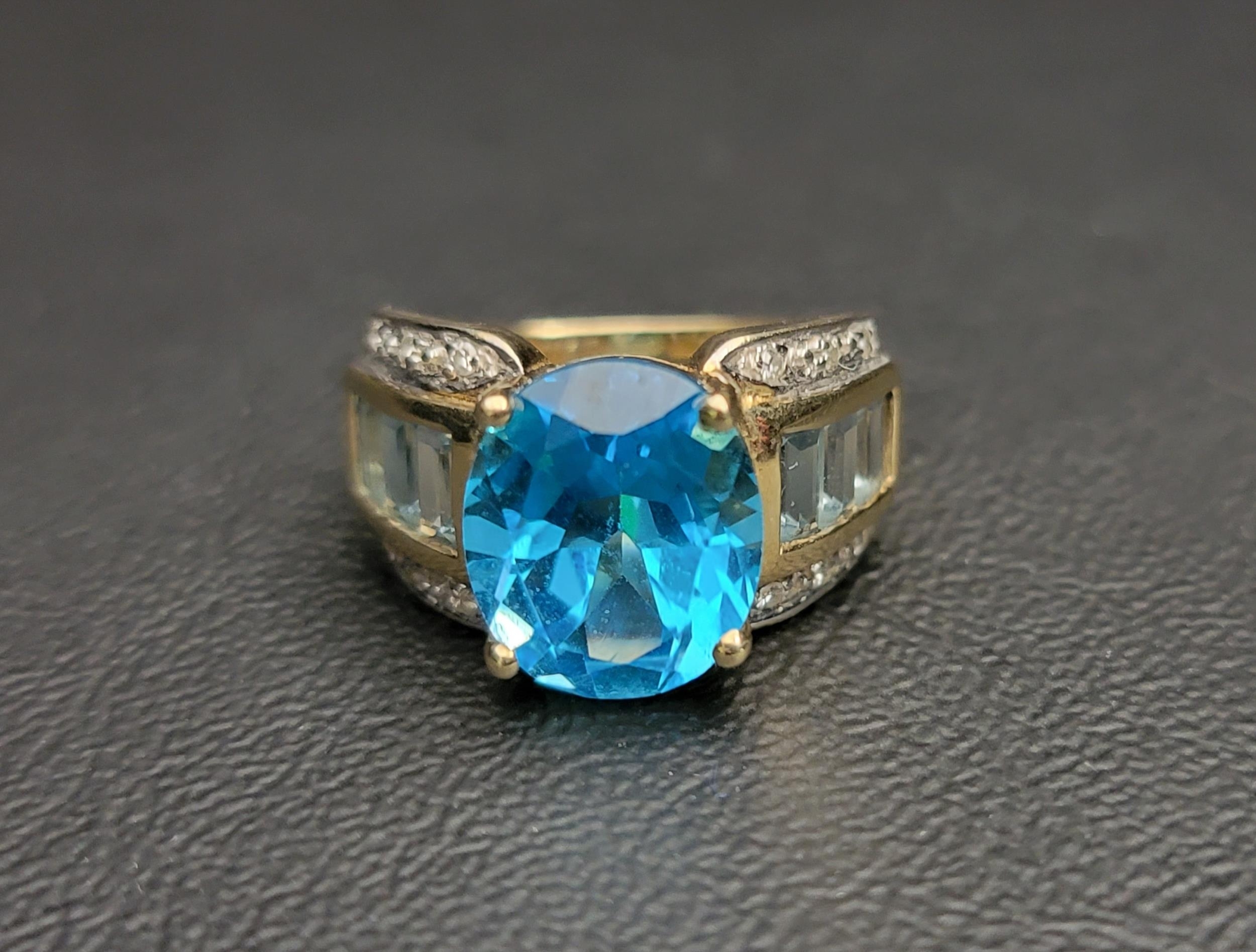 the large central blue topaz measuring approximately 11.8mm x 9.8mm x 6.9mm, flanked by aquamarine and diamond set shoulders, in nine carat gold, ring size M and approximately 6 grams
