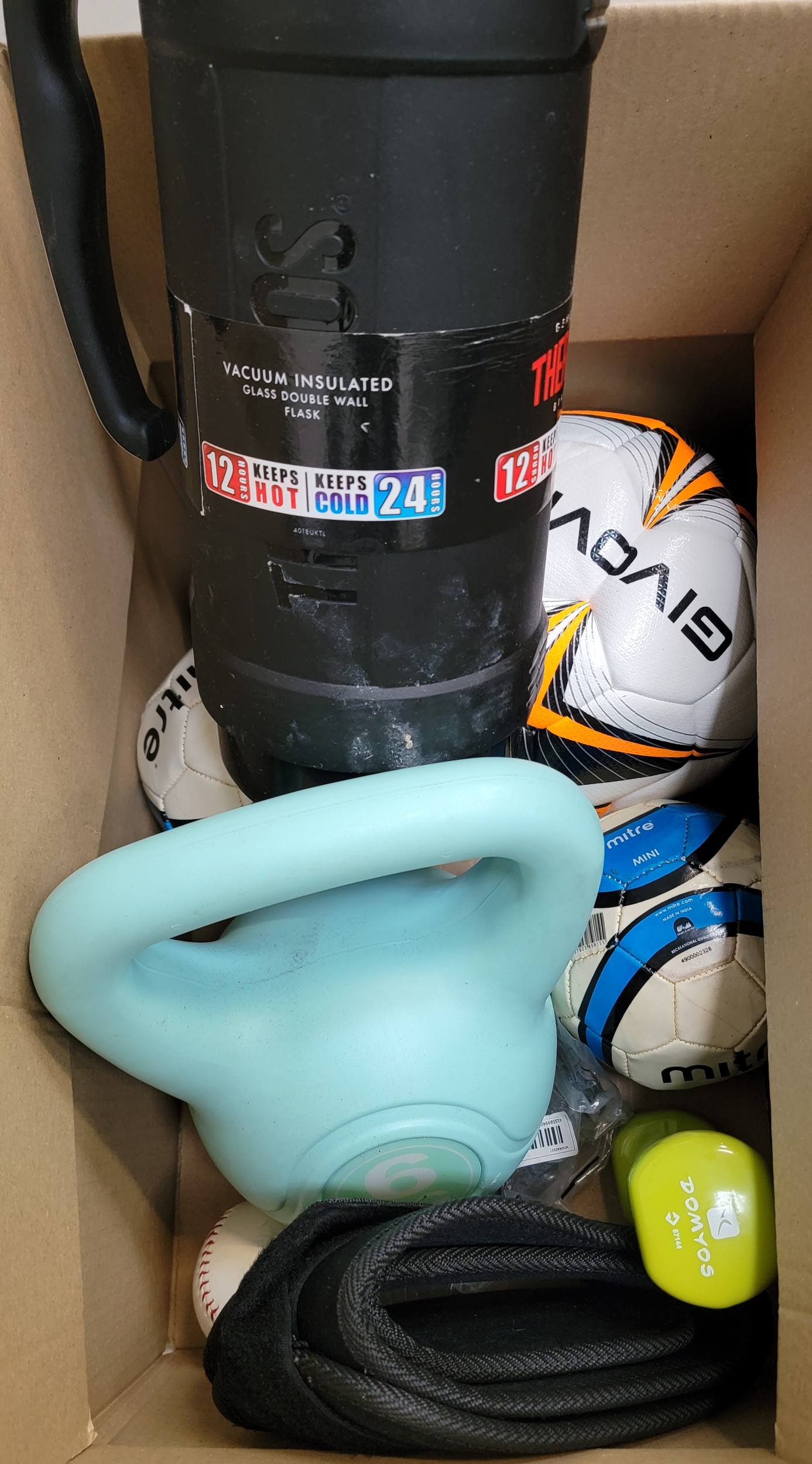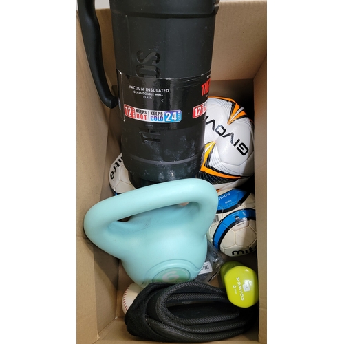 ONE BOX OF SPORTING AND LEISURE ITEMSincluding weights, sports balls and a large thermos