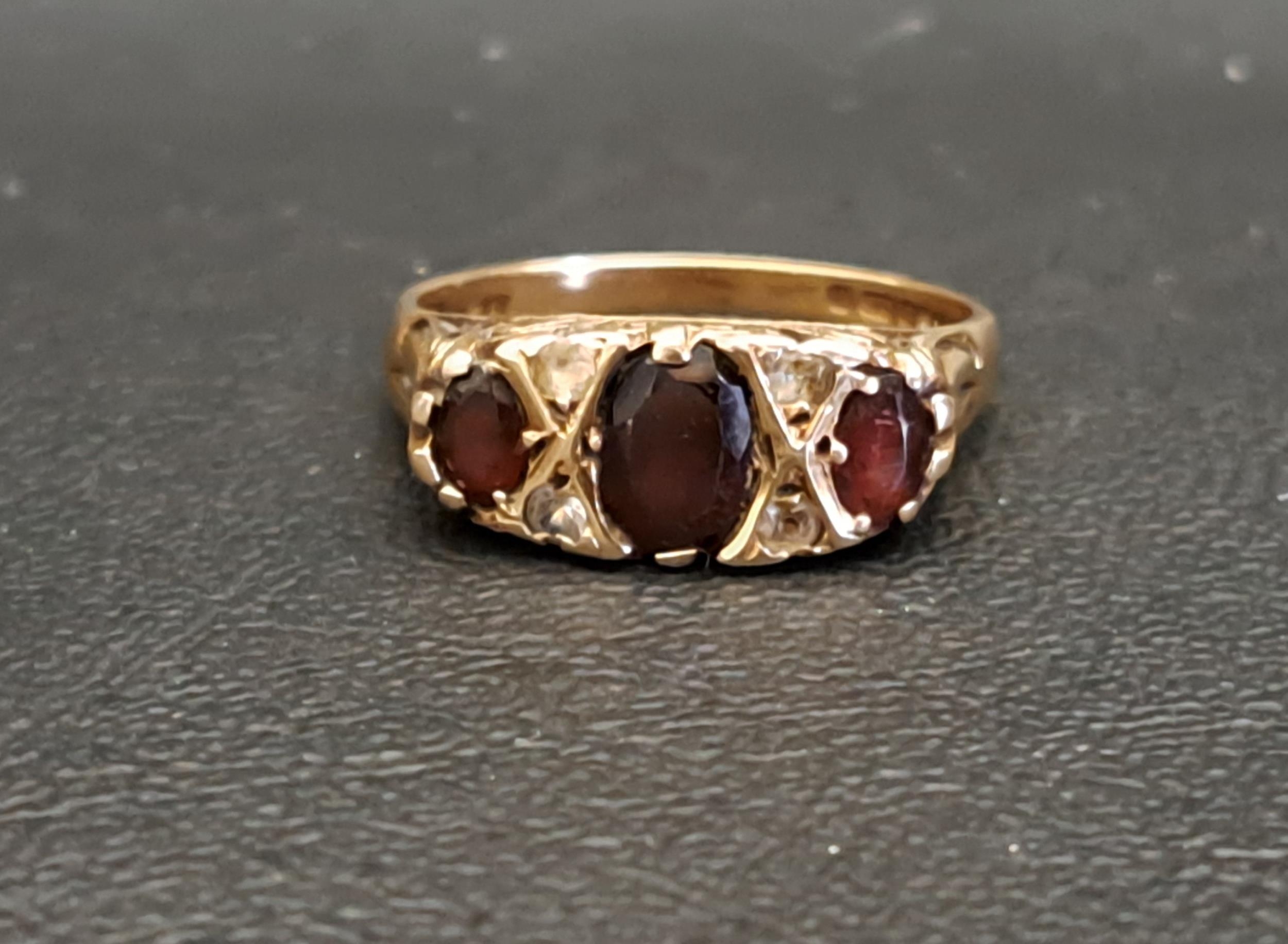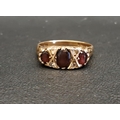 the three graduated oval cut garnets separated by small CZ stones, on nine carat gold shank, ring size Q and approximately 3.4 grams