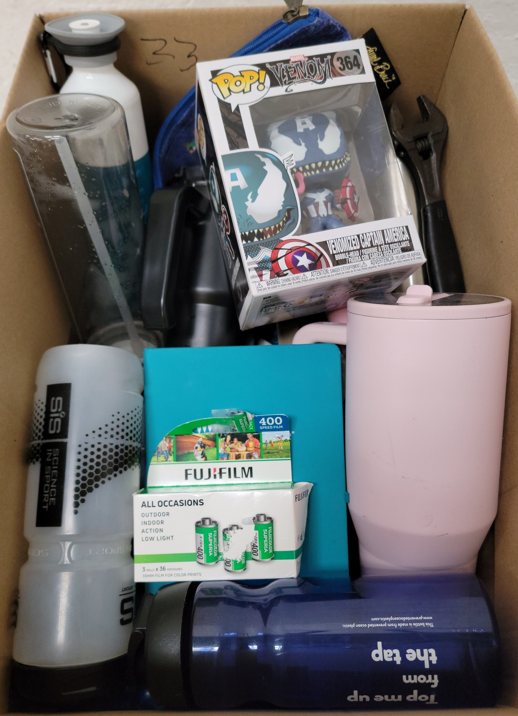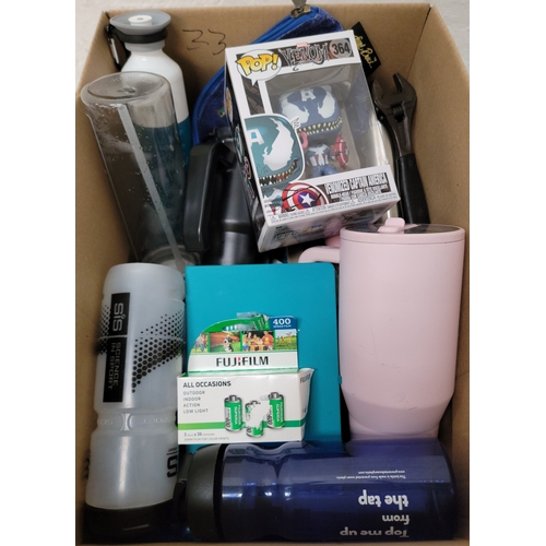 ONE BOX OF MISCELLANEOUS ITEMSincluding a Funko Pop Marvel figure, Fujifilm camera film and water bottles