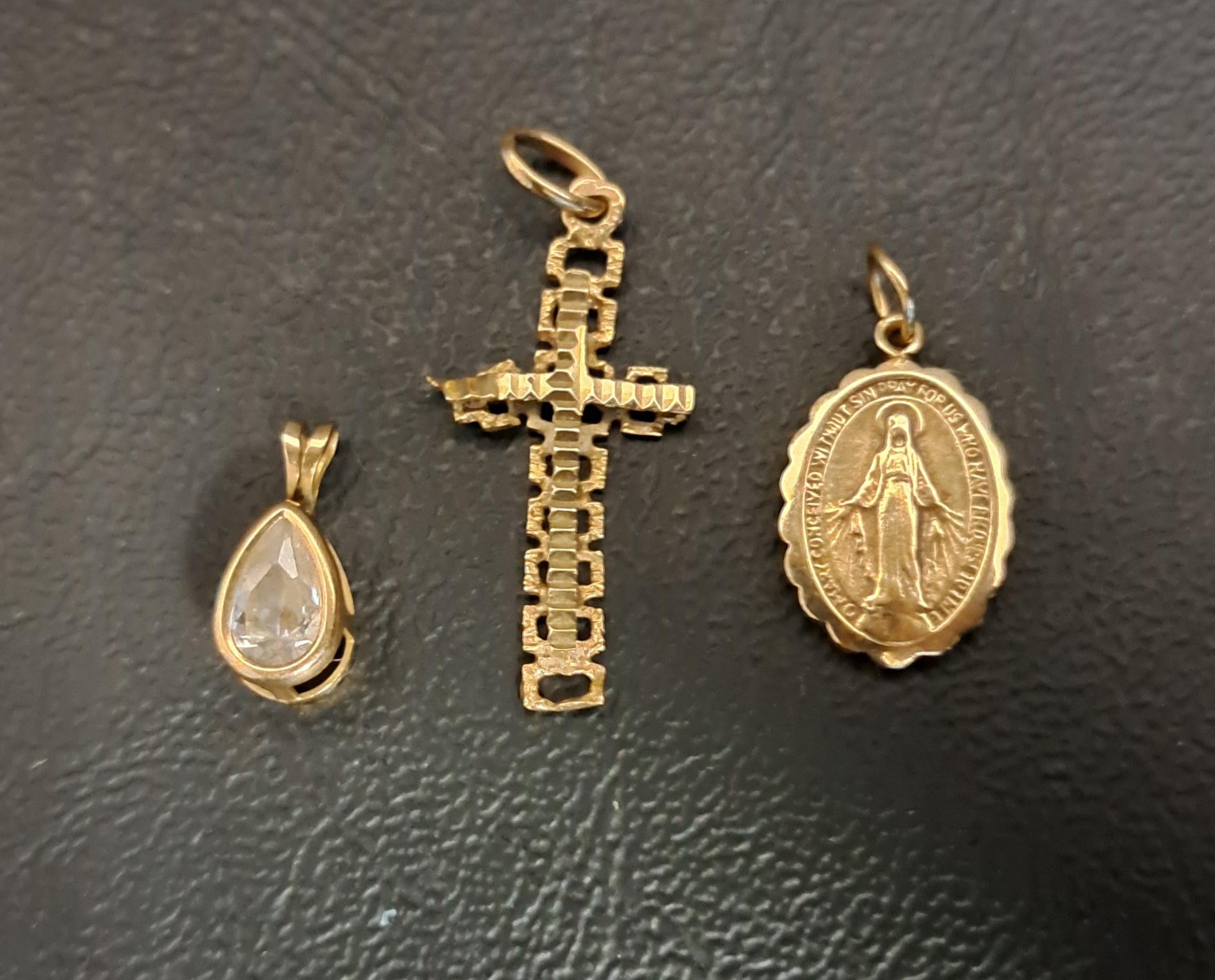 one with bezel set pear cut CZ, another with an image of the Madonna, and the last a cross pendant, total weight approximately 3.2 grams