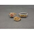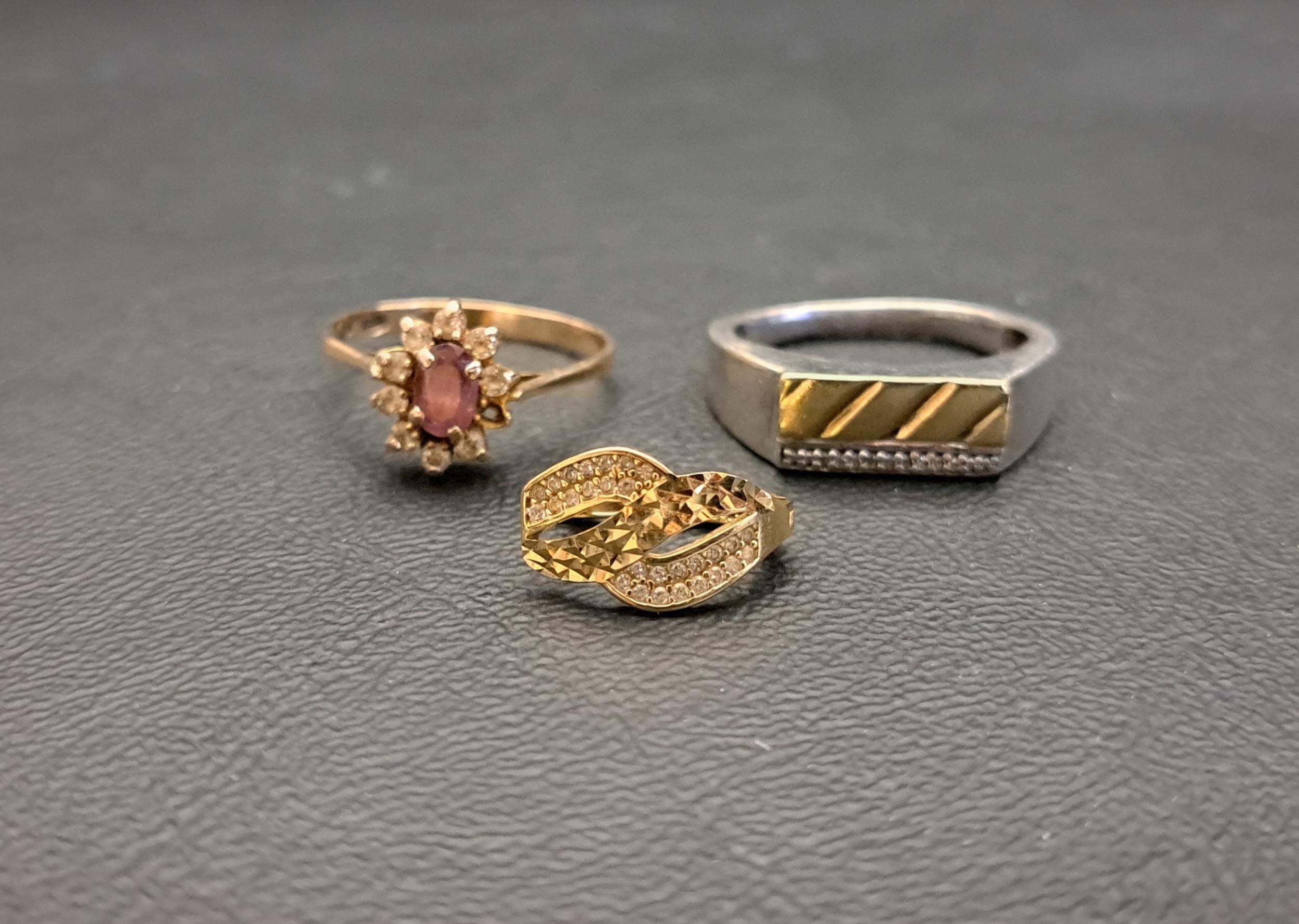 comprising a single fourteen carat gold earring, 1.3 grams; an amethyst and CZ cluster ring (one CZ missing), on eight carat gold shank marked 333, 1.9 grams; and a silver ring with gold detail and small diamonds