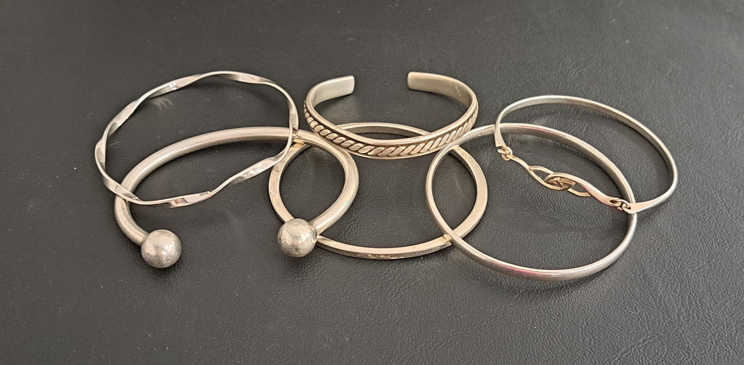 including one with ball finials, another with entwined detail and a twisted example, total weight approximately 114.7 grams