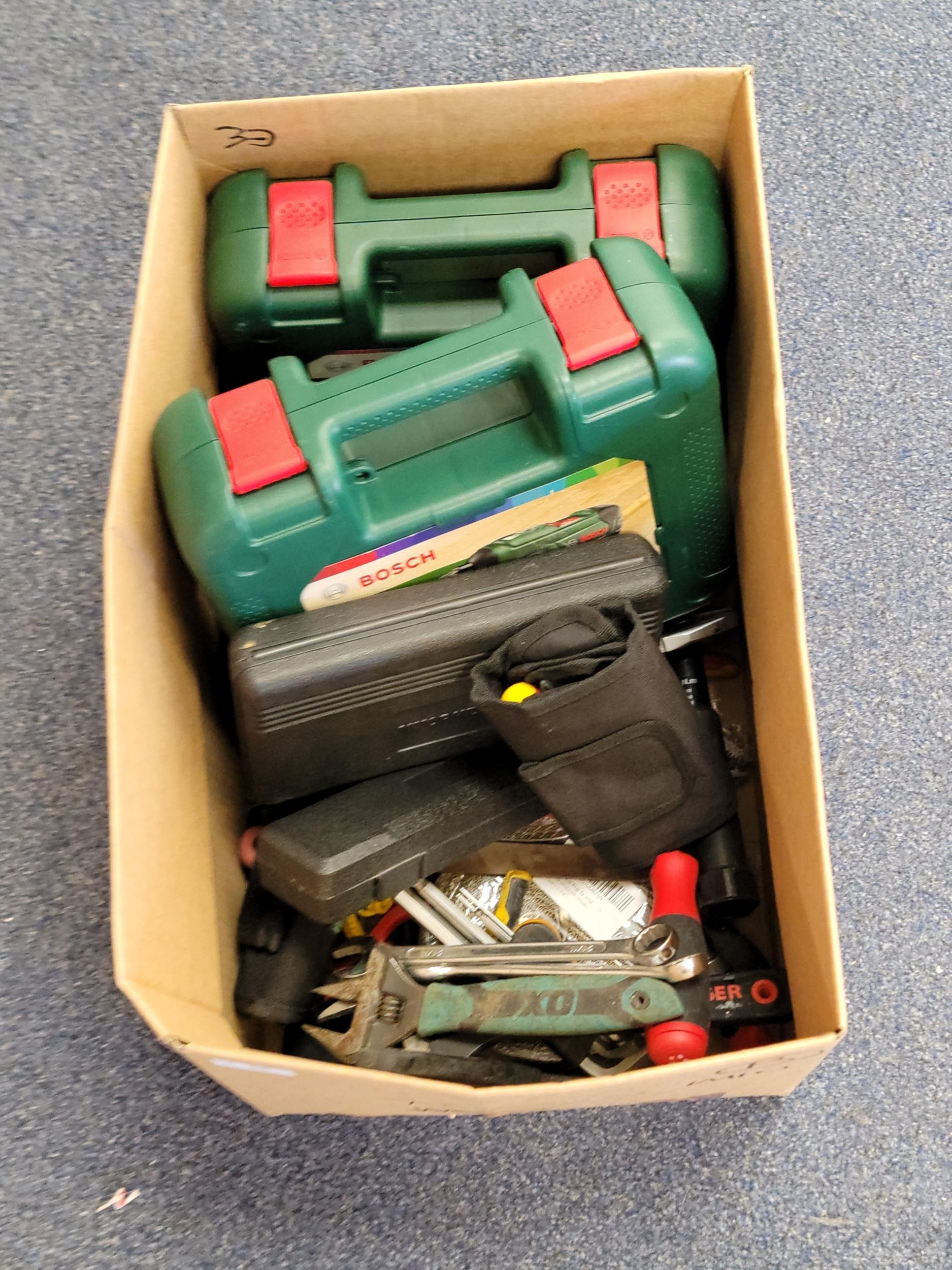 ONE BOX OF TOOLSincluding: Power and hand tools, a Bosch cordless screwdriver, a Bosch cordless combi drill