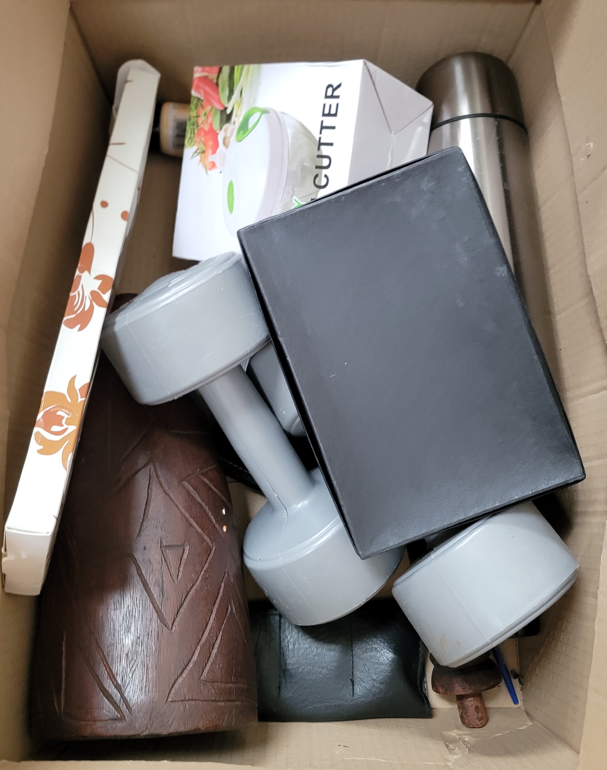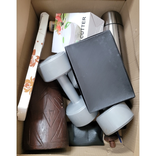 ONE BOX OF MISCELLANEOUS ITEMSincluding a hardwood Tiki torch, weights, acrylic paints etc.