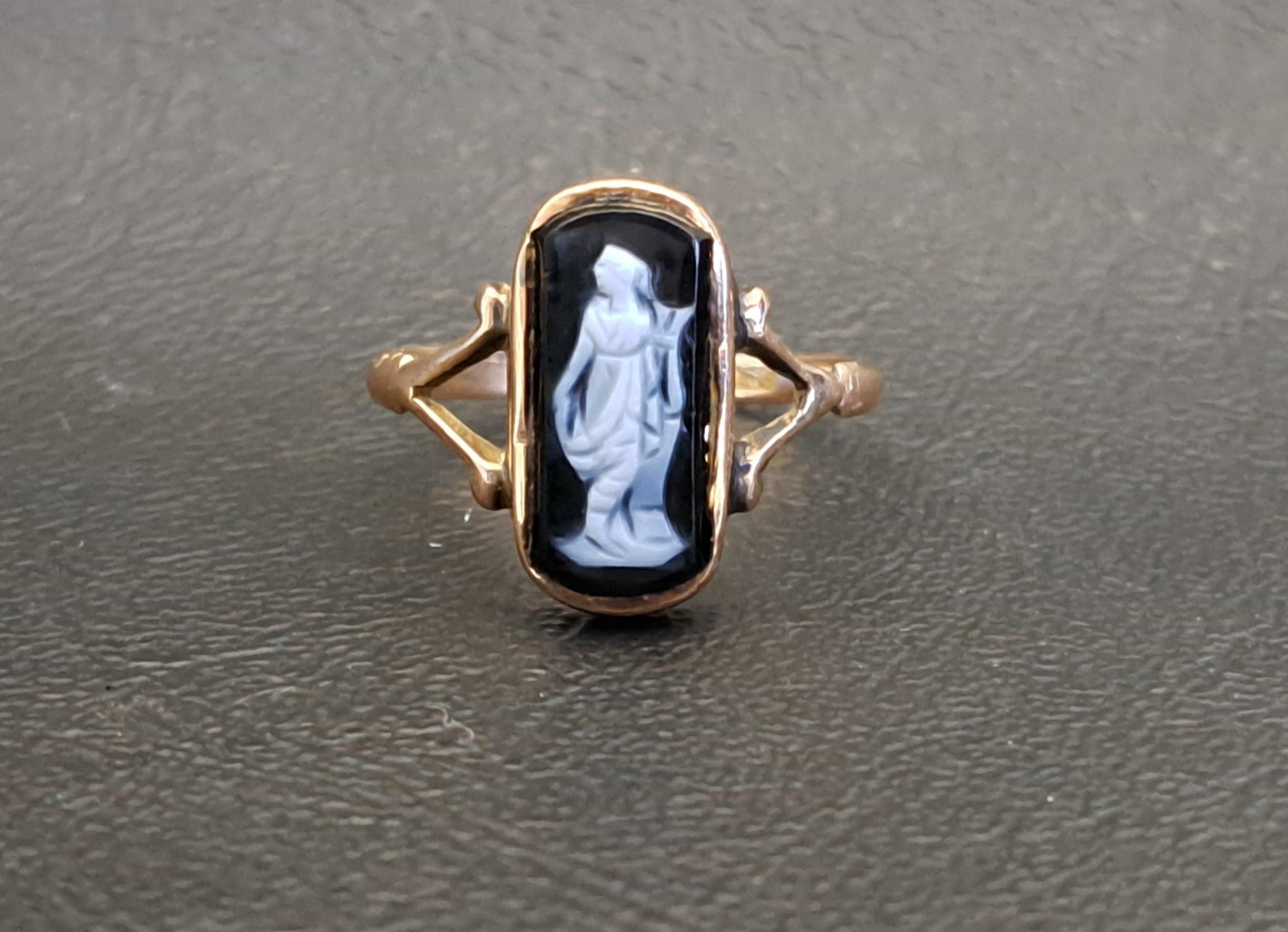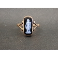 depicting a classical female figure, on nine carat gold shank, ring size P-Q and approximately 2.3 grams