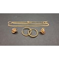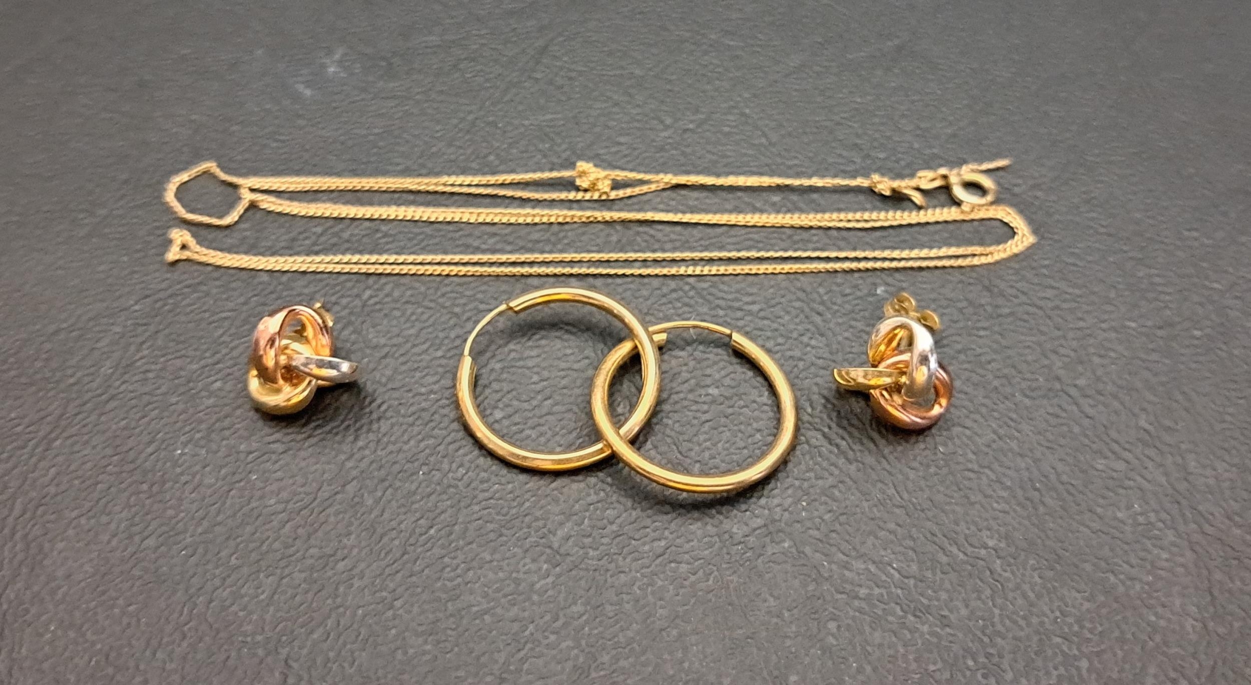 comprising a pair of nine carat gold hoop earrings, a pair of unmarked three tone gold knot earrings; and broken nine carat gold neck chain, total weight approximately 1.8 grams