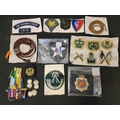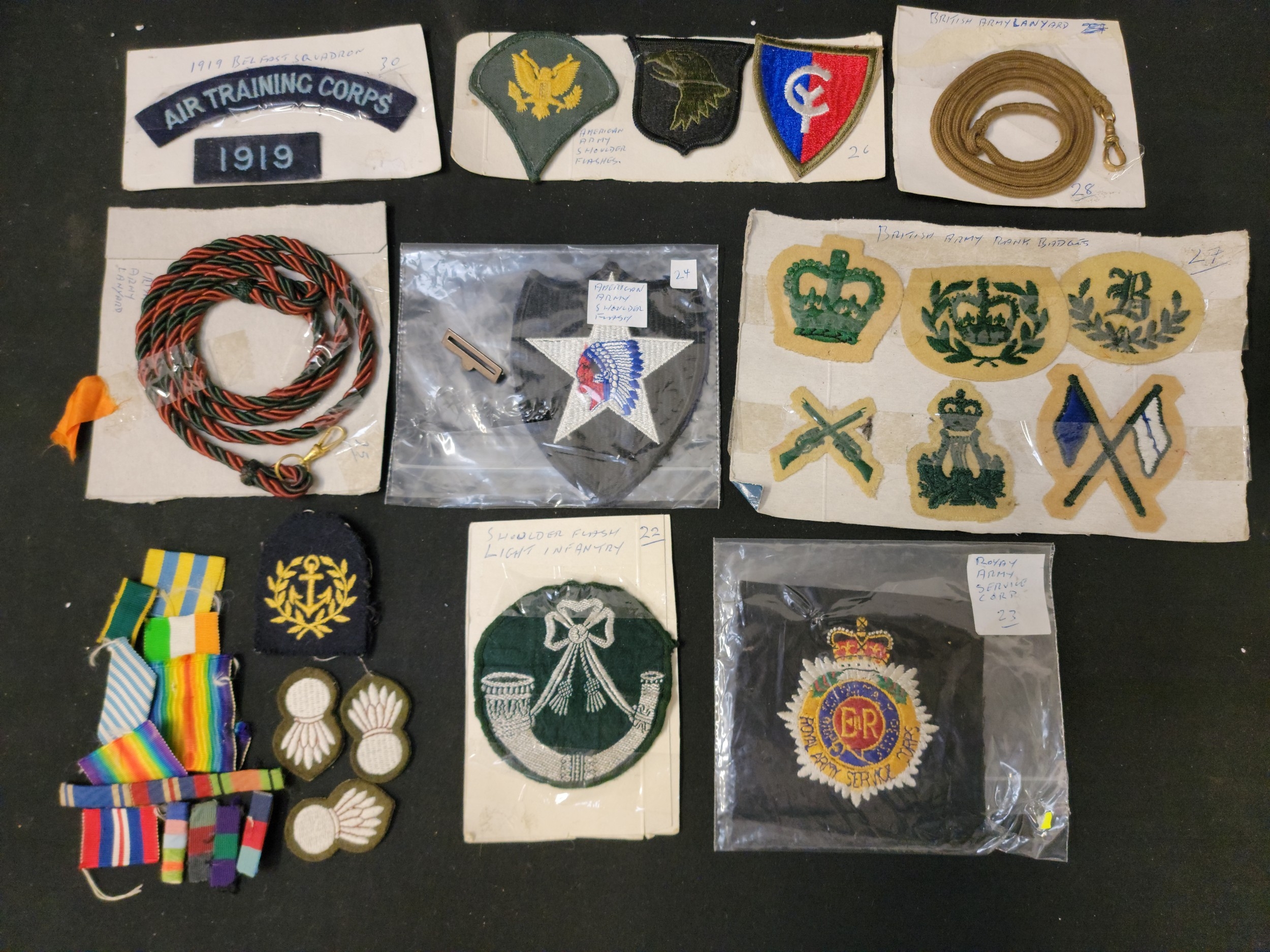 including a British Royal Navy Leading Seamen insignia patch, a WWII Burma Star medal ribbon bar, a Grenadier Guards trade badge, British Army lanyard, a U.S Army's 101st Airborne Division