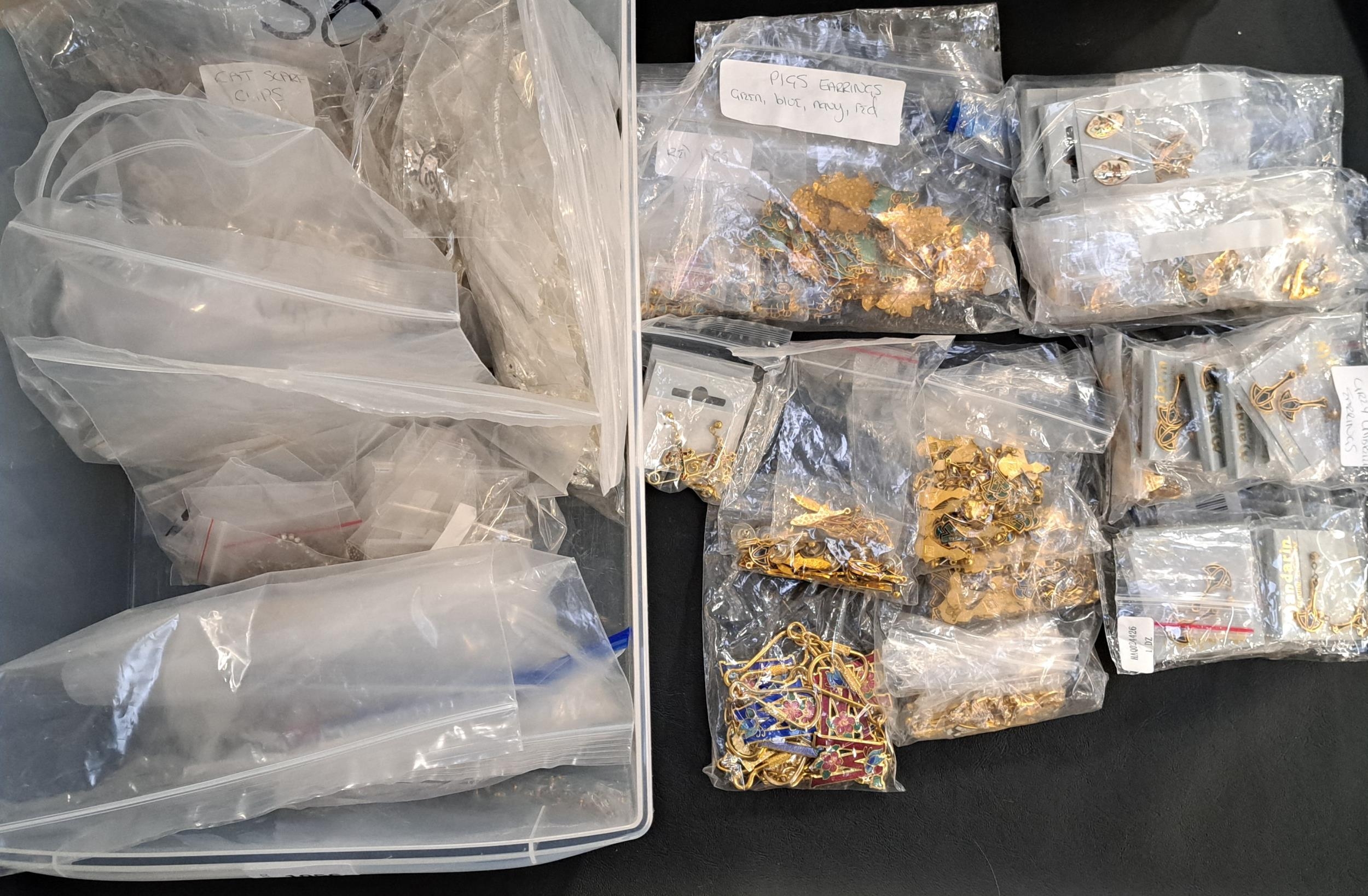comprising multiple examples of each style, including dog, cat and owl brooches, diamante set necklaces, stone set pendants and necklaces, and a large selection of enamelled and other earrings