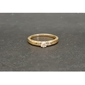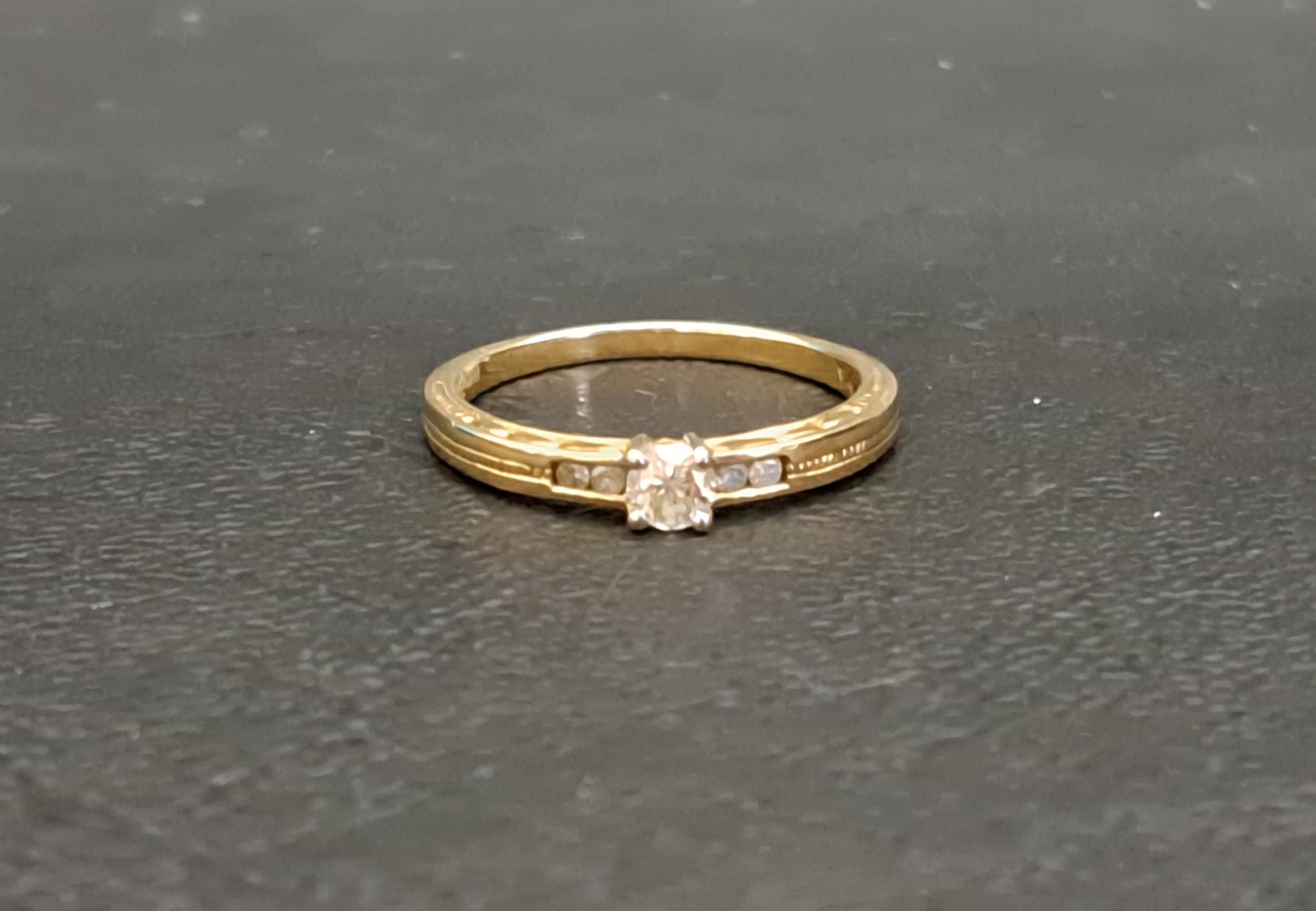 the central round cut diamond approximately 0.2cts flanked by small diamonds to the shoulders, on nine carat gold shank, ring size N and approximately 2 grams
