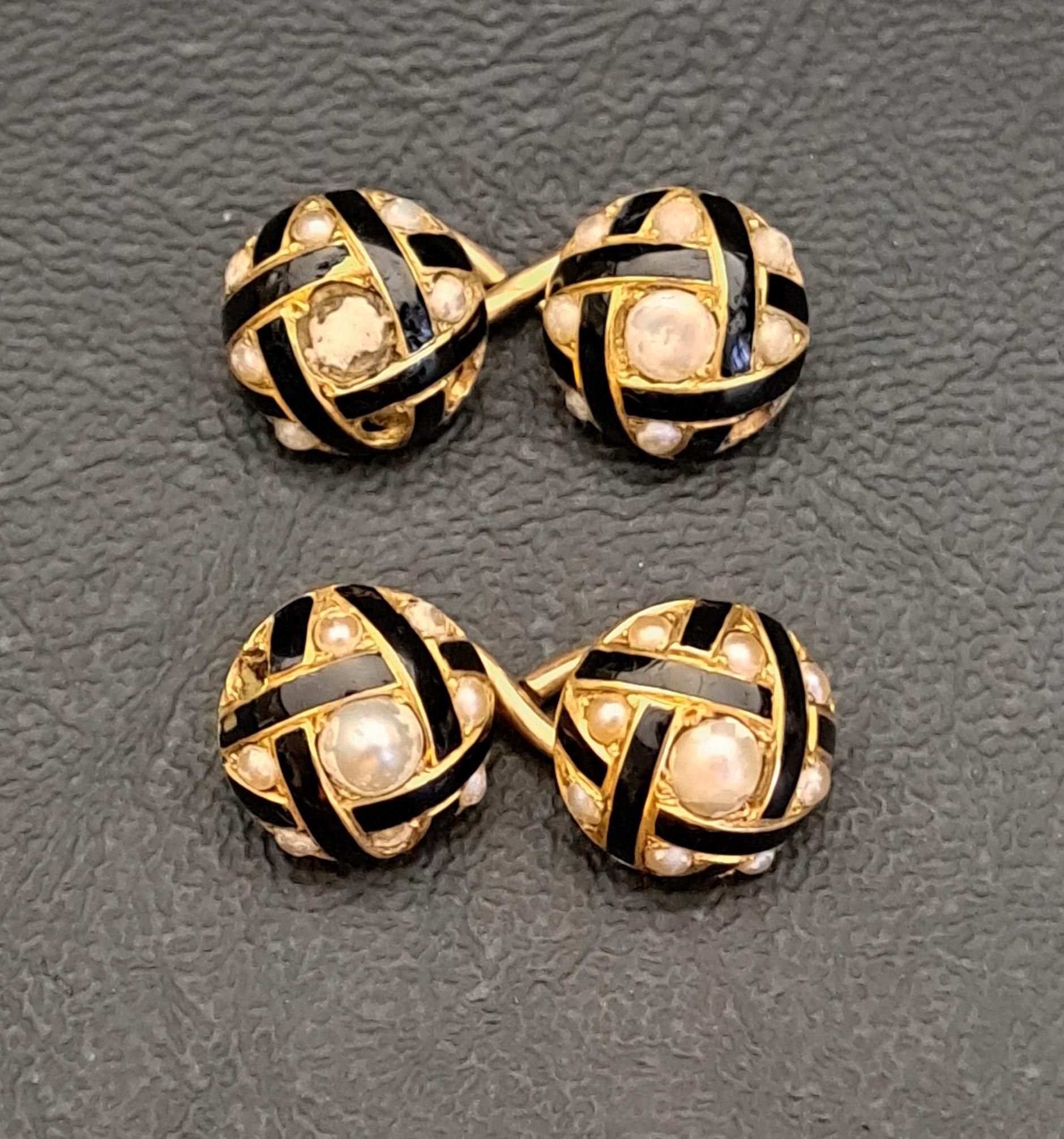 PAIR OF GOLD SEED PEARL AND BLACK ENAMEL CUFFLINKS