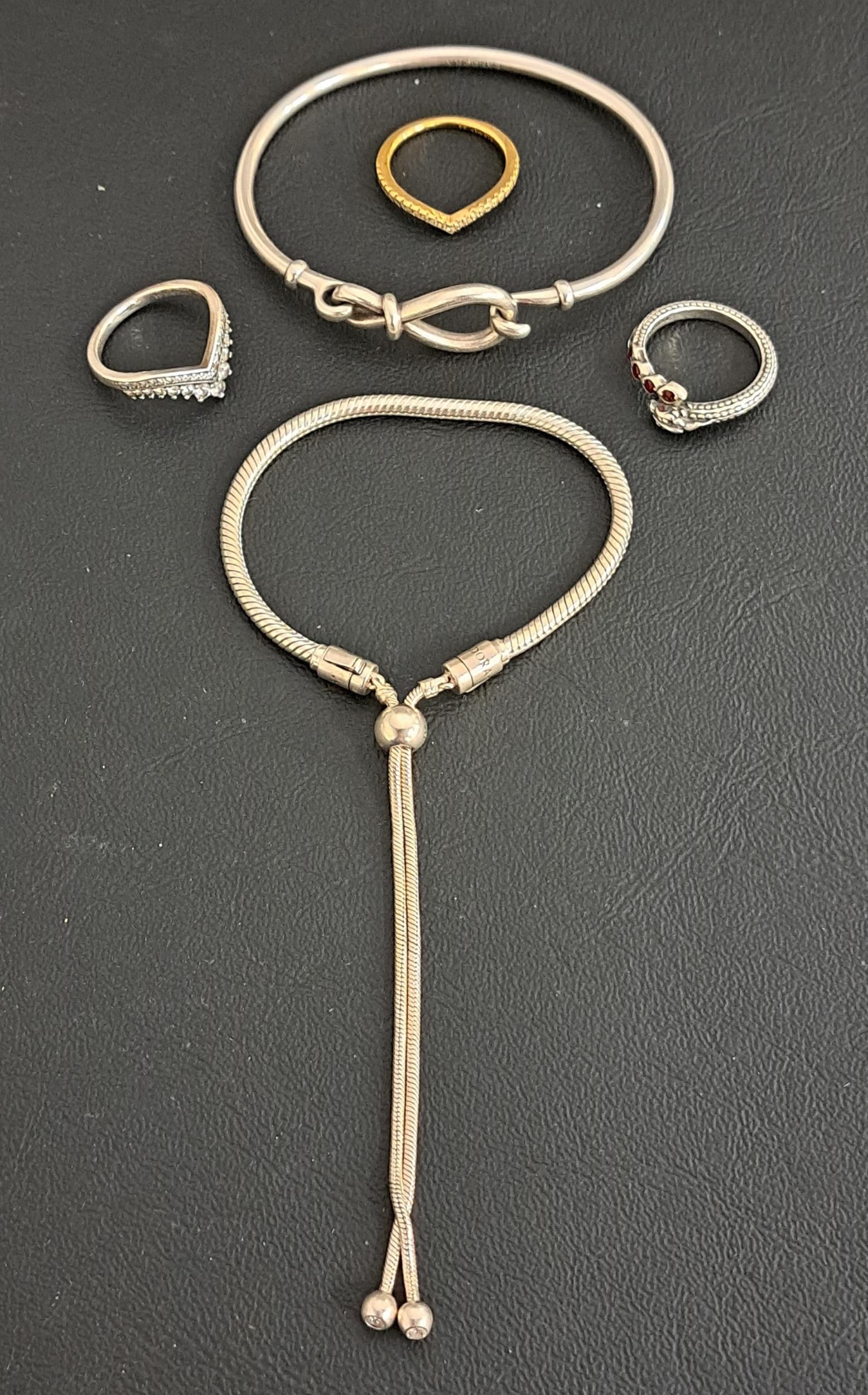comprising a silver slider bracelet, a silver infinity knot bangle, and three rings - silver dragon, silver Princess Wishbone and gold plated Sparkling Wishbone