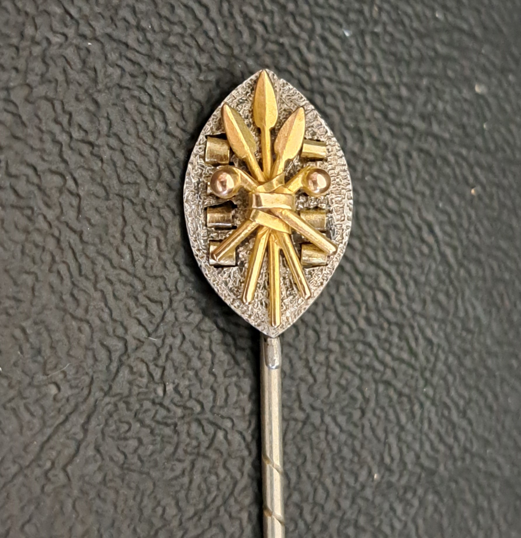 in unmarked silver with applied unmarked gold war clubs and spears, 6.5cm long, in fitted box
