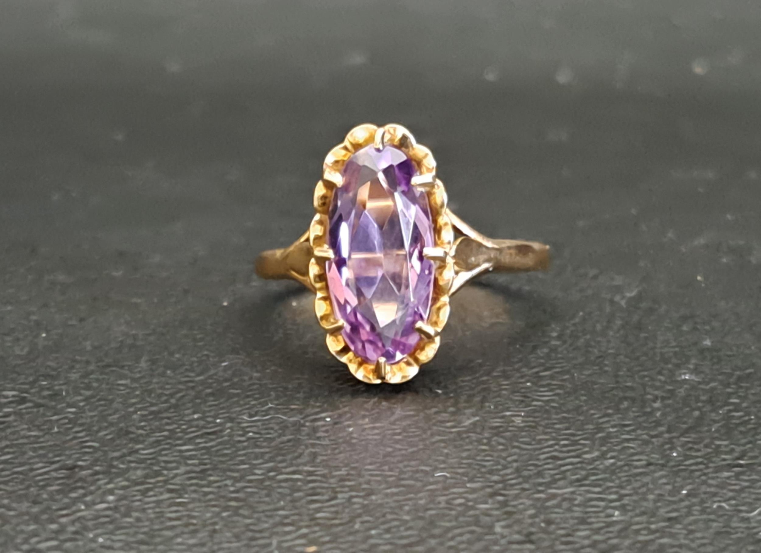 the oval cut amethyst measuring approximately 12 x 6 x 2.9mm, on nine carat gold shank, ring size O-P and approximately 3 grams