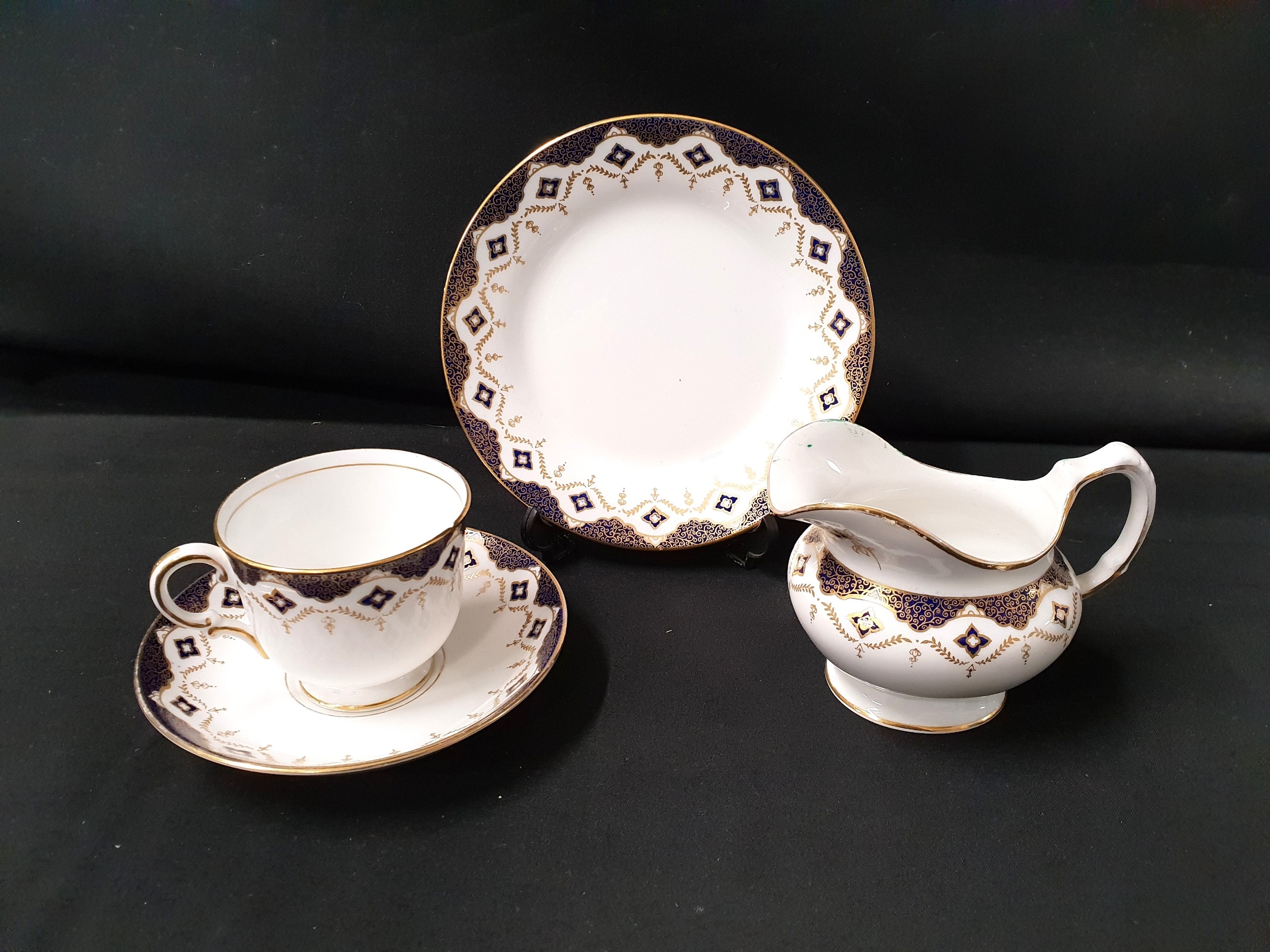 with blue border decoration on white ground, with gilt rim and detailing, comprising six cups, seven saucers, twelve side plates, and a milk jug