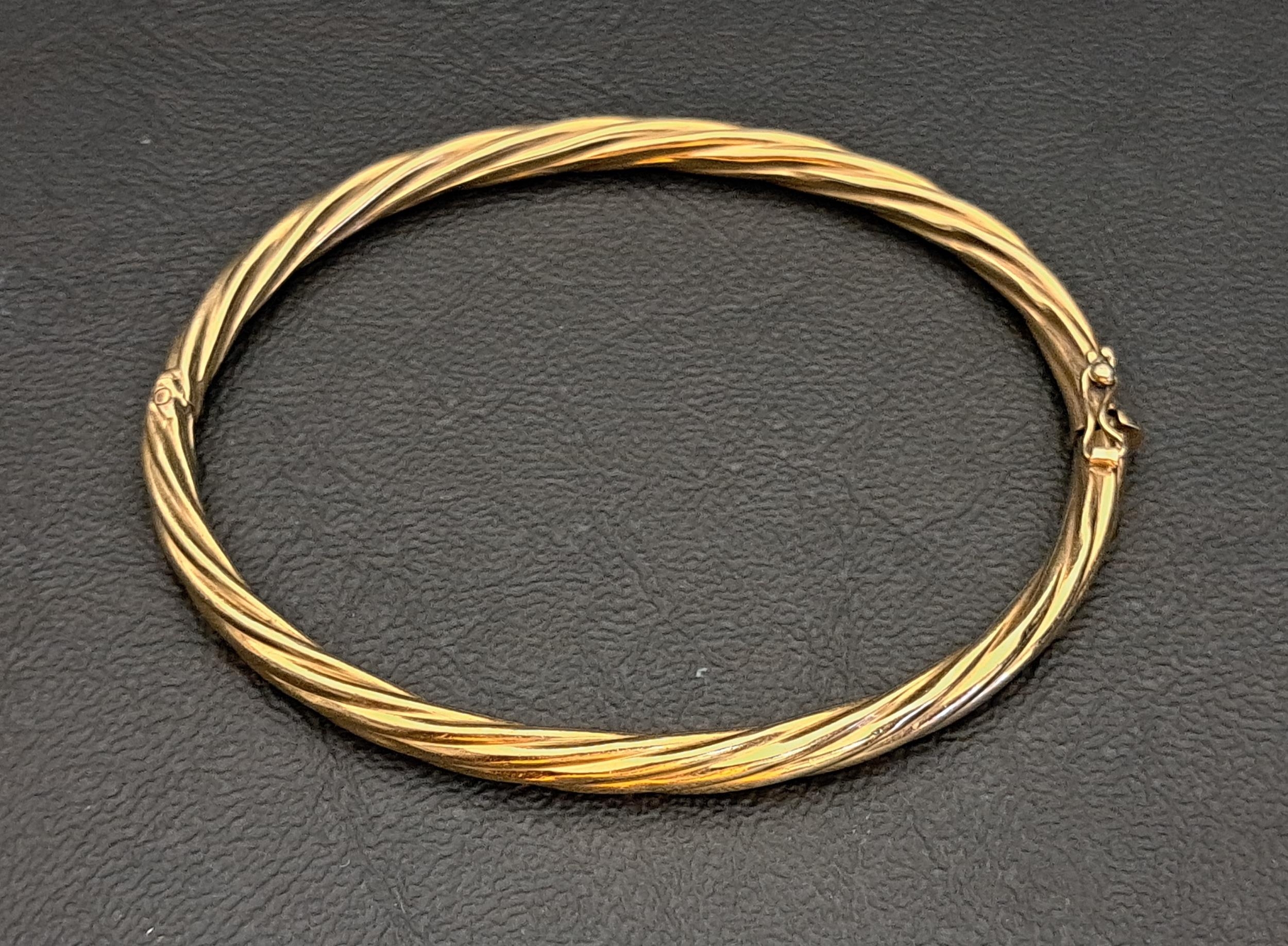 NINE CARAT GOLD BANGLE of twist design, with safety clasp, a...