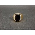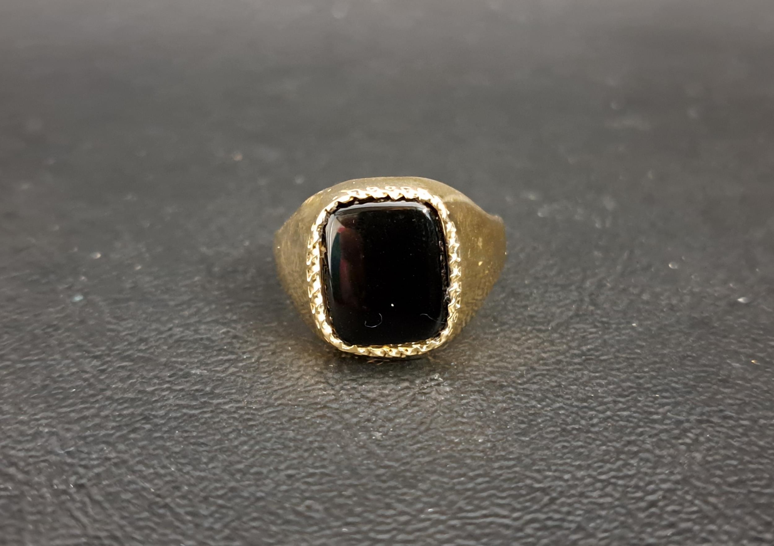 BLACK ONYX SIGNET RINGon nine carat gold shank, ring size Q-R and approximately 3.2 grams
