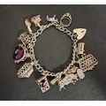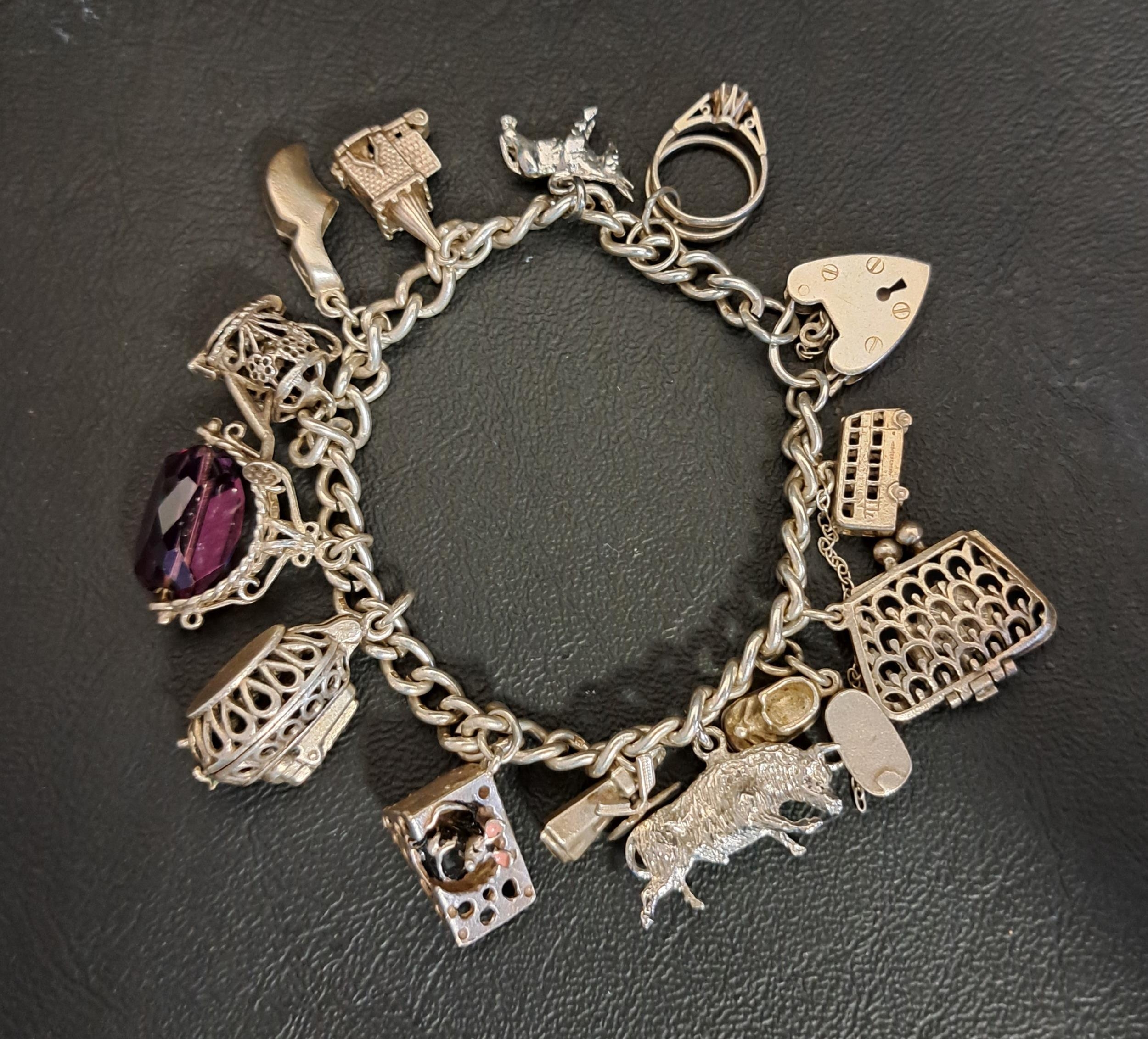 with a selection of articulated charms including a church containing a wedding, a watering can containing a flower and a purse containing a compact and lipstick, with heart padlock clasp, 52 grams