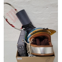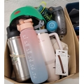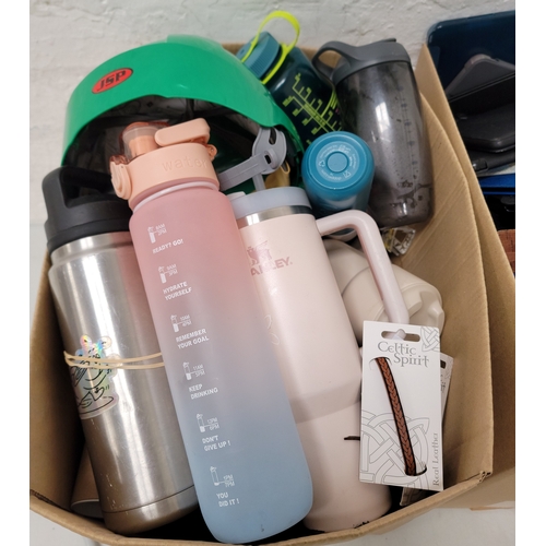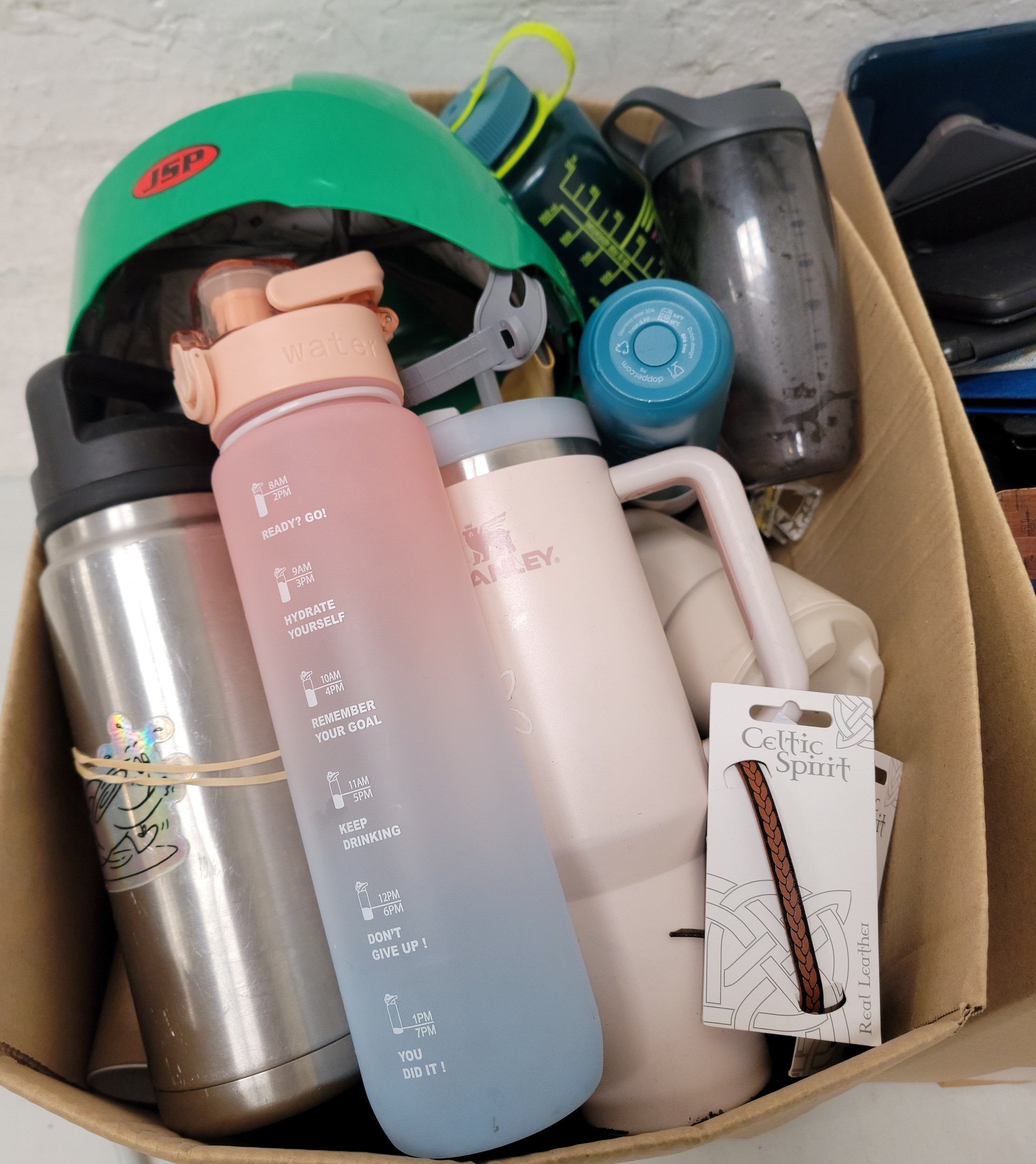 ONE BOX OF MISCELLANEOUS ITEMSincluding a Stanley water bottle, hard hat, souvenirs, etc.