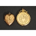 one of circular form with engraved scroll decoration, the other of heart shape also with engraved decoration