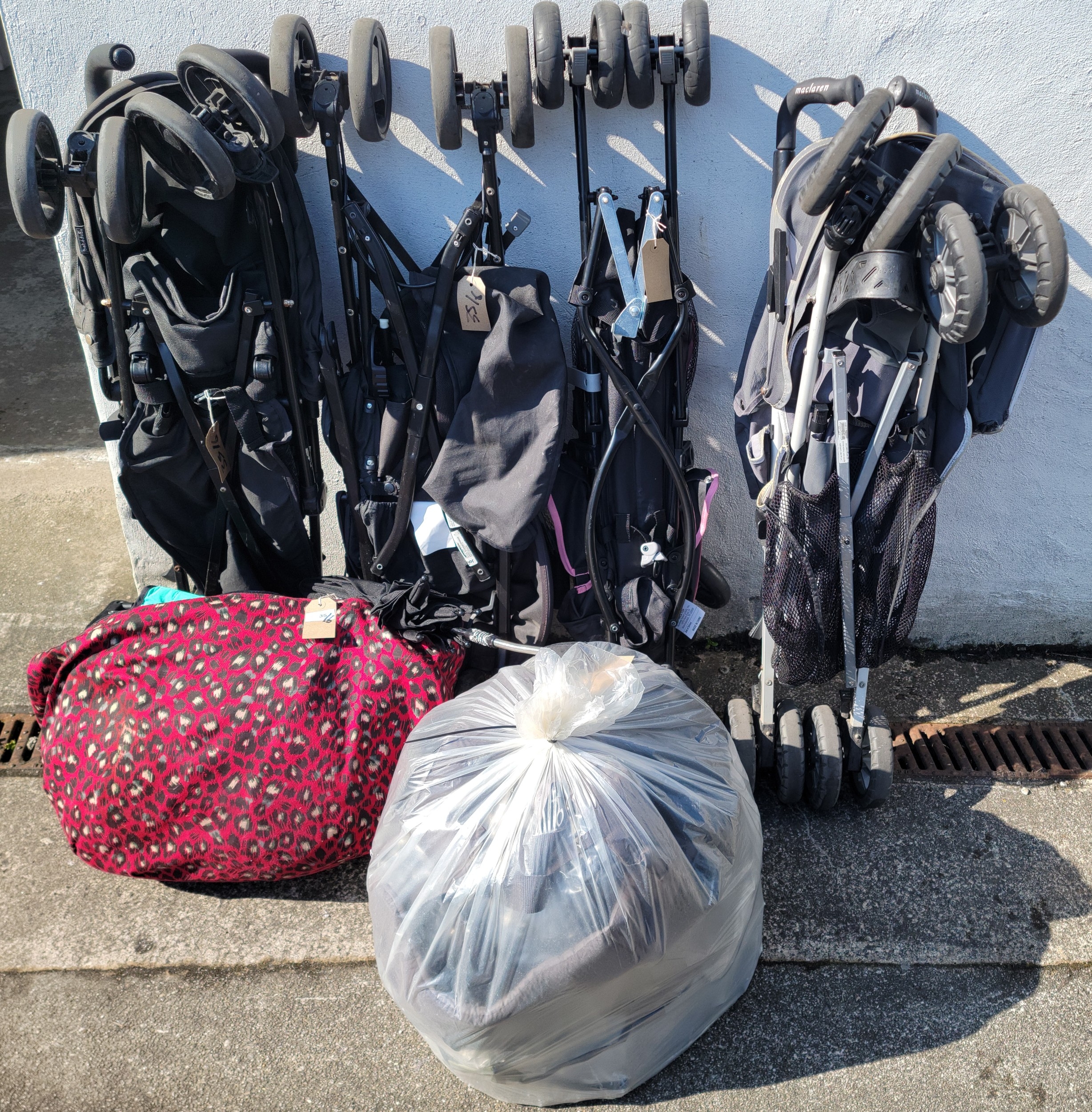 SELECTION OF FOUR BUGGIES, ONE BUGGY IN A BAG AND A BAG OF PRAM ACCESSORIES including: Maclaren, Joie