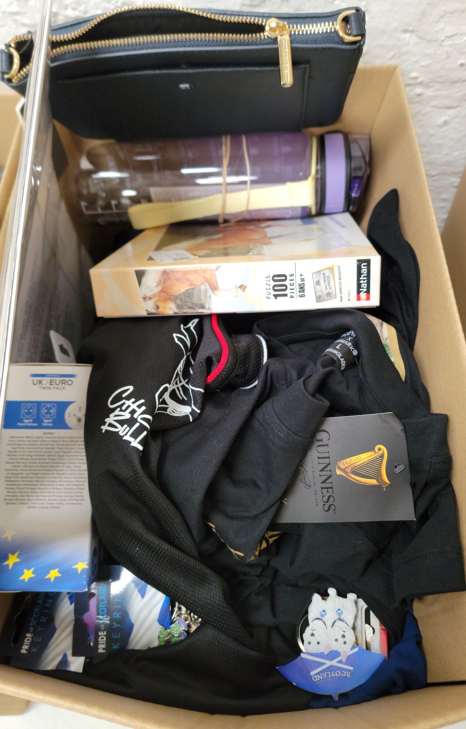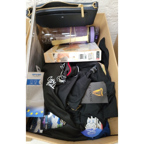ONE BOX OF NEW ITEMSincluding clothing, souvenirs, a water bottle, etc.