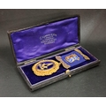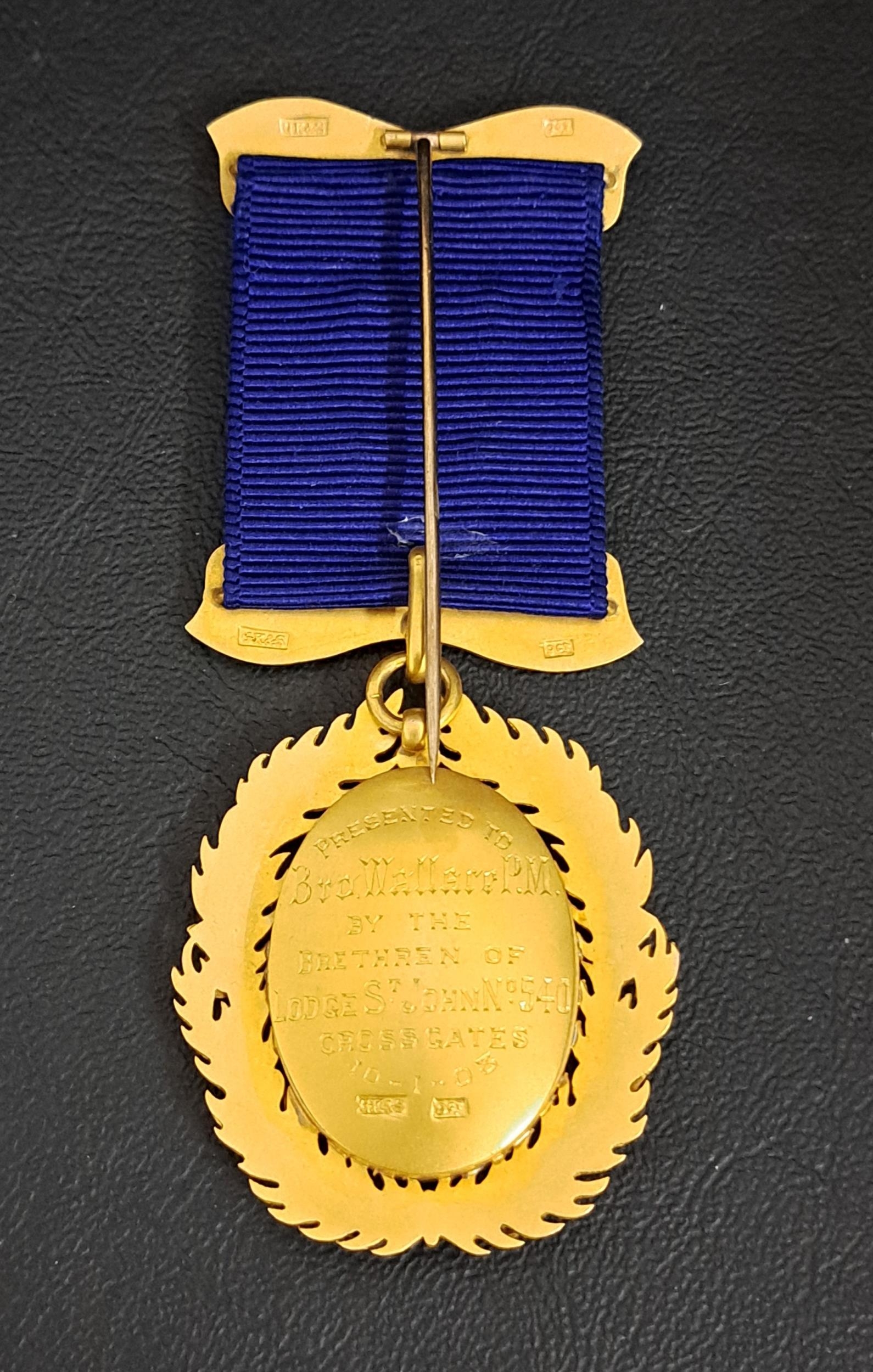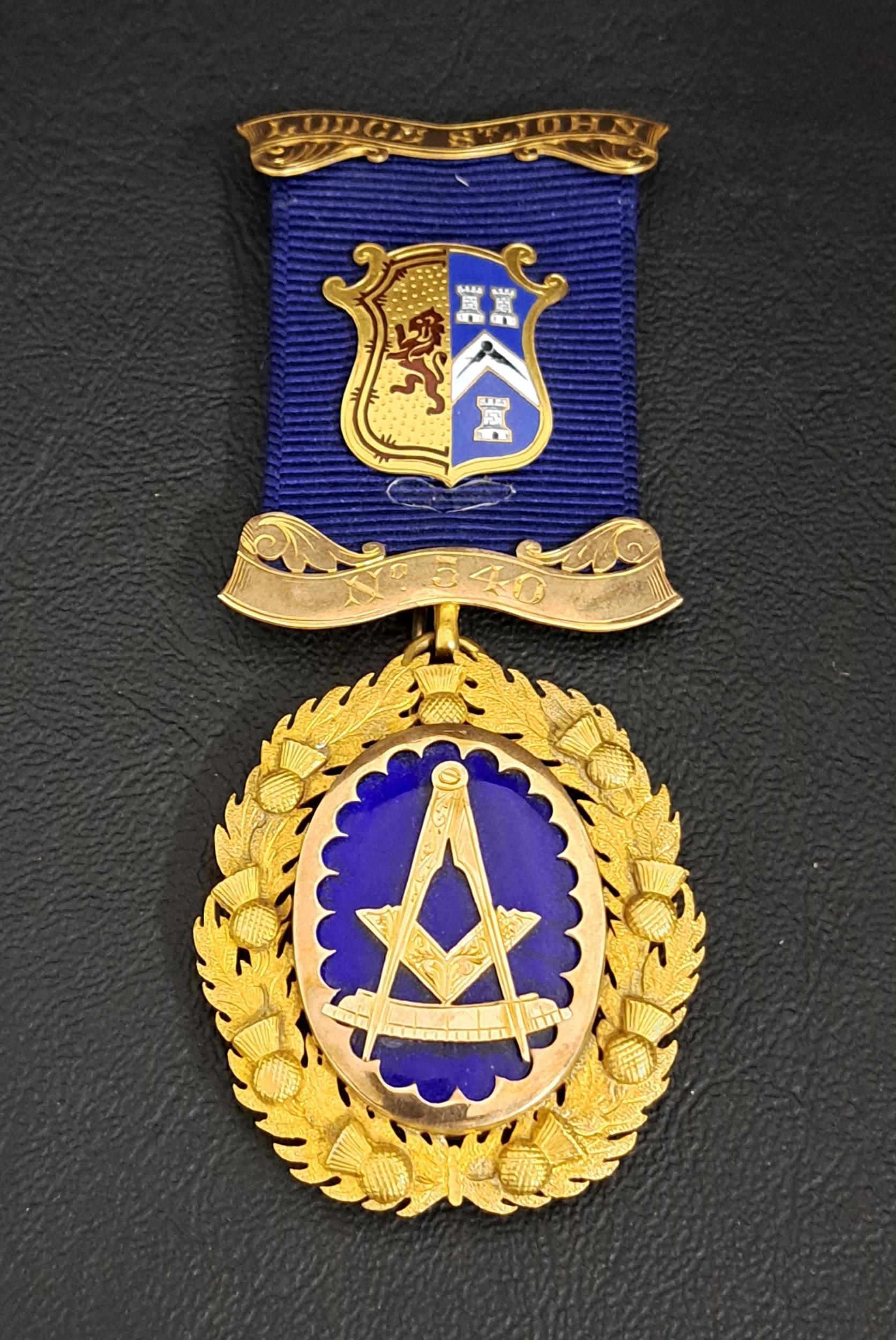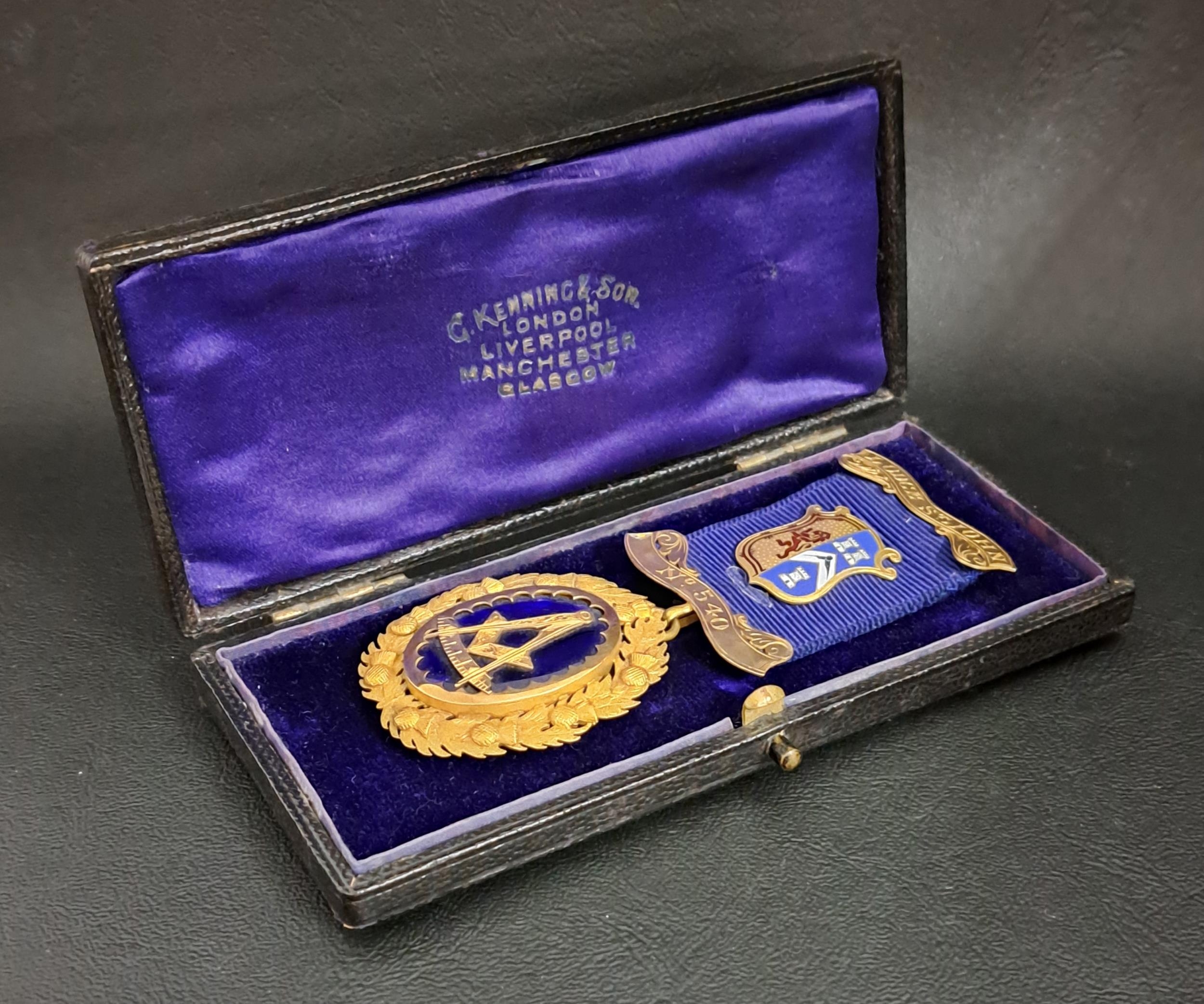 the ribbon bars engraved 'Lodge St. John' and 'No.540', the reverse of the medal engraved 'Presented to Bro. Wallace by the Brethren of Lodge ST. John No.540. Crossgates. 10.1.08', total weight approximately 23.7 grams, in fitted box