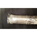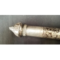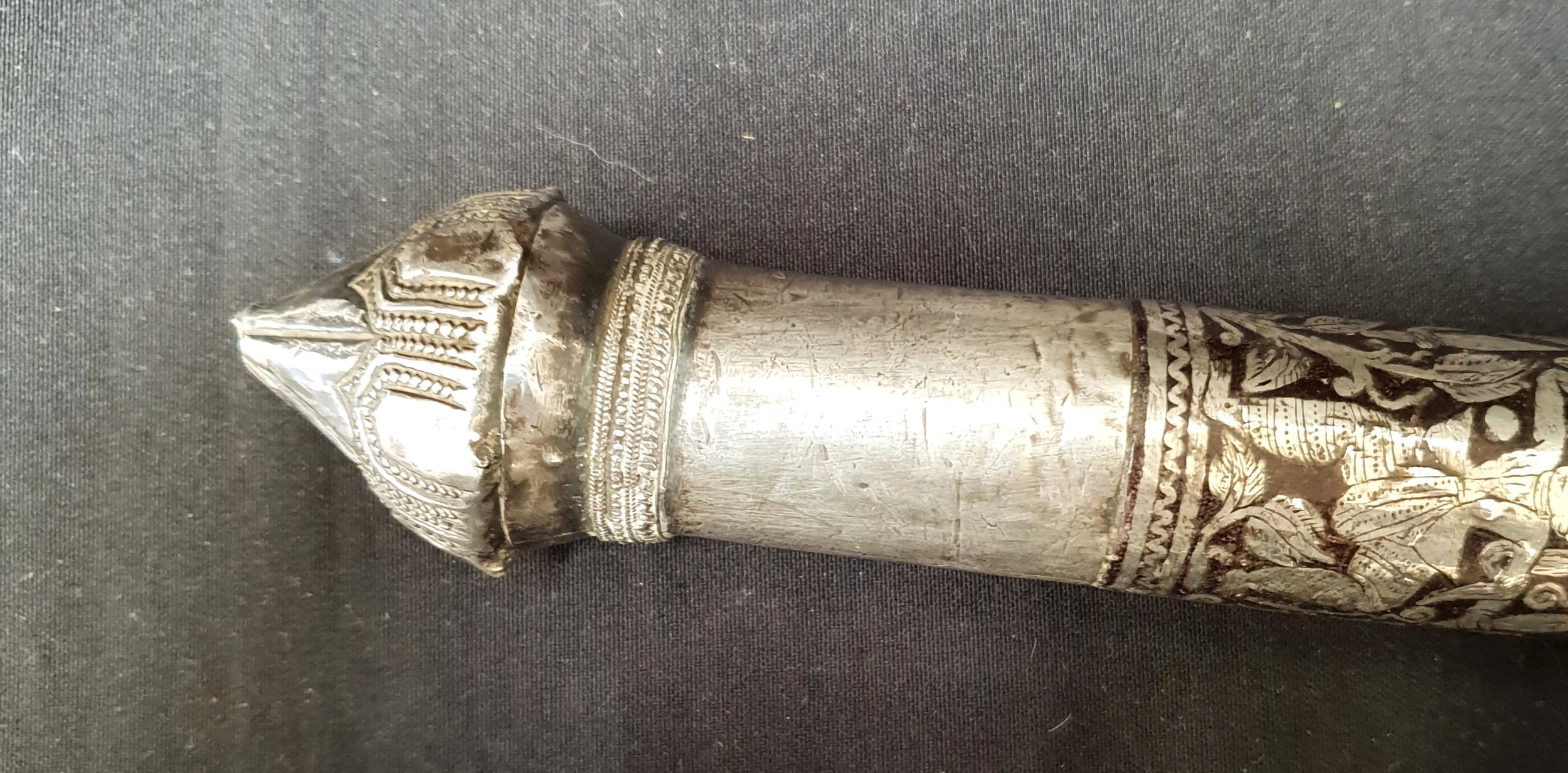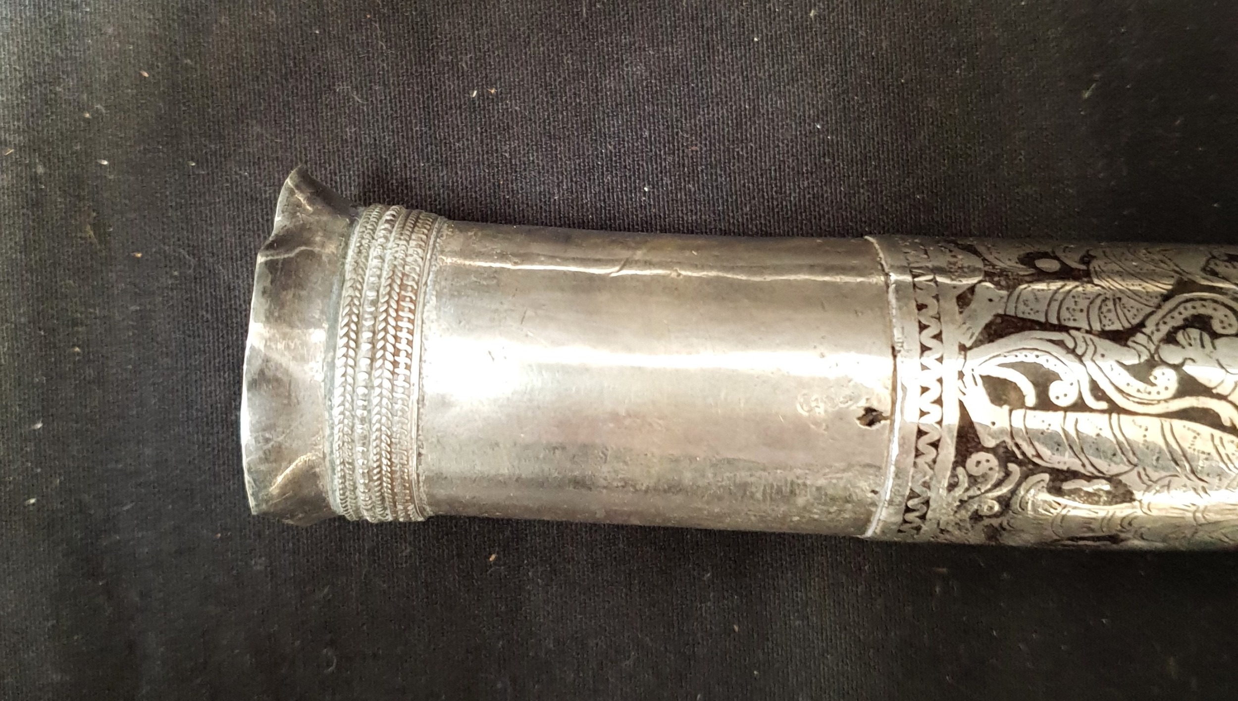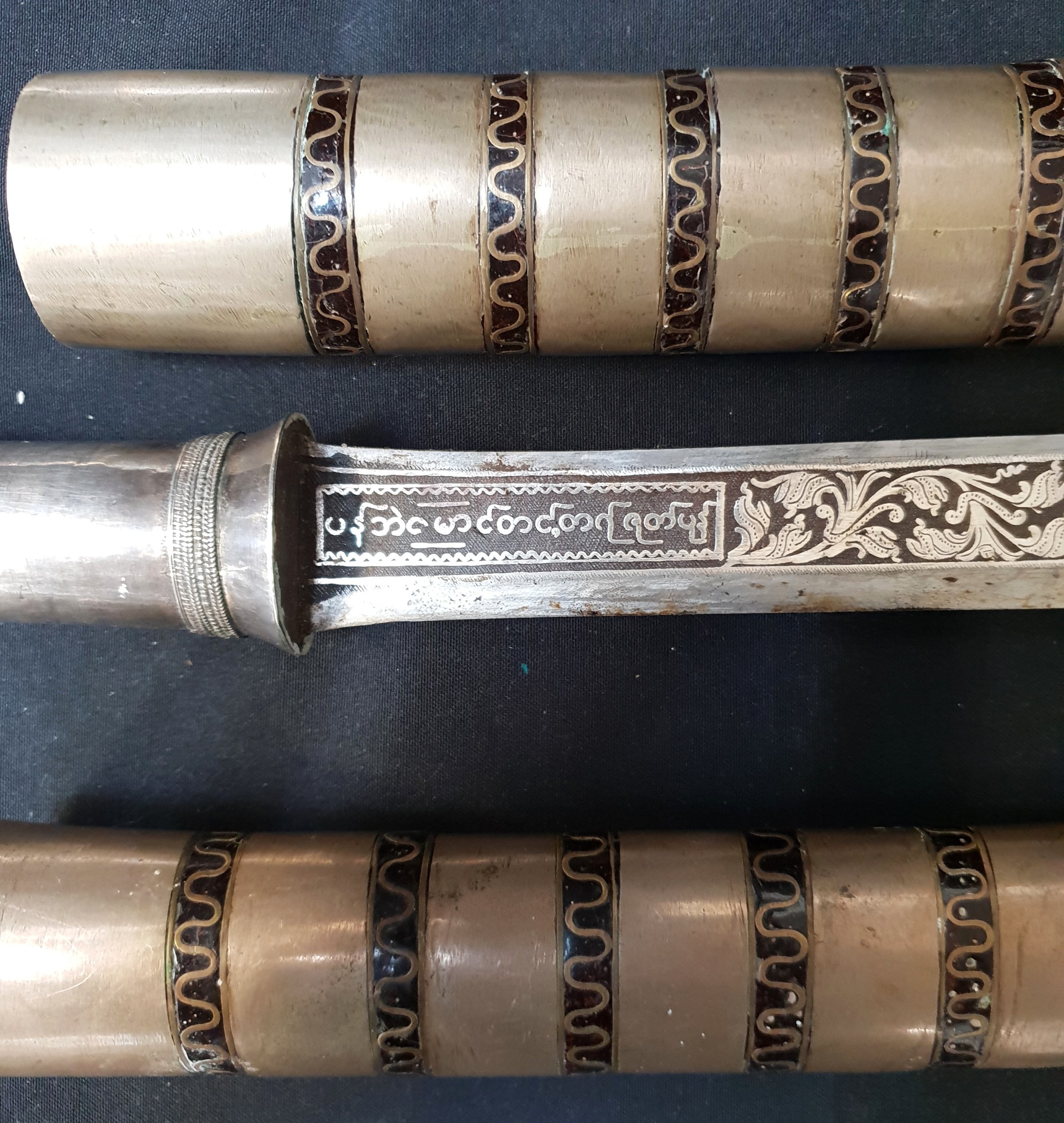 with silver damascened hilt depicting figures with animal headdress, in flora surround, the blade decorated with Burmese script and further damascened decoration depicting warriors and dancing figures (one Dha missing pommel) blade length 62cm, with white metal damascened scabbards (2)