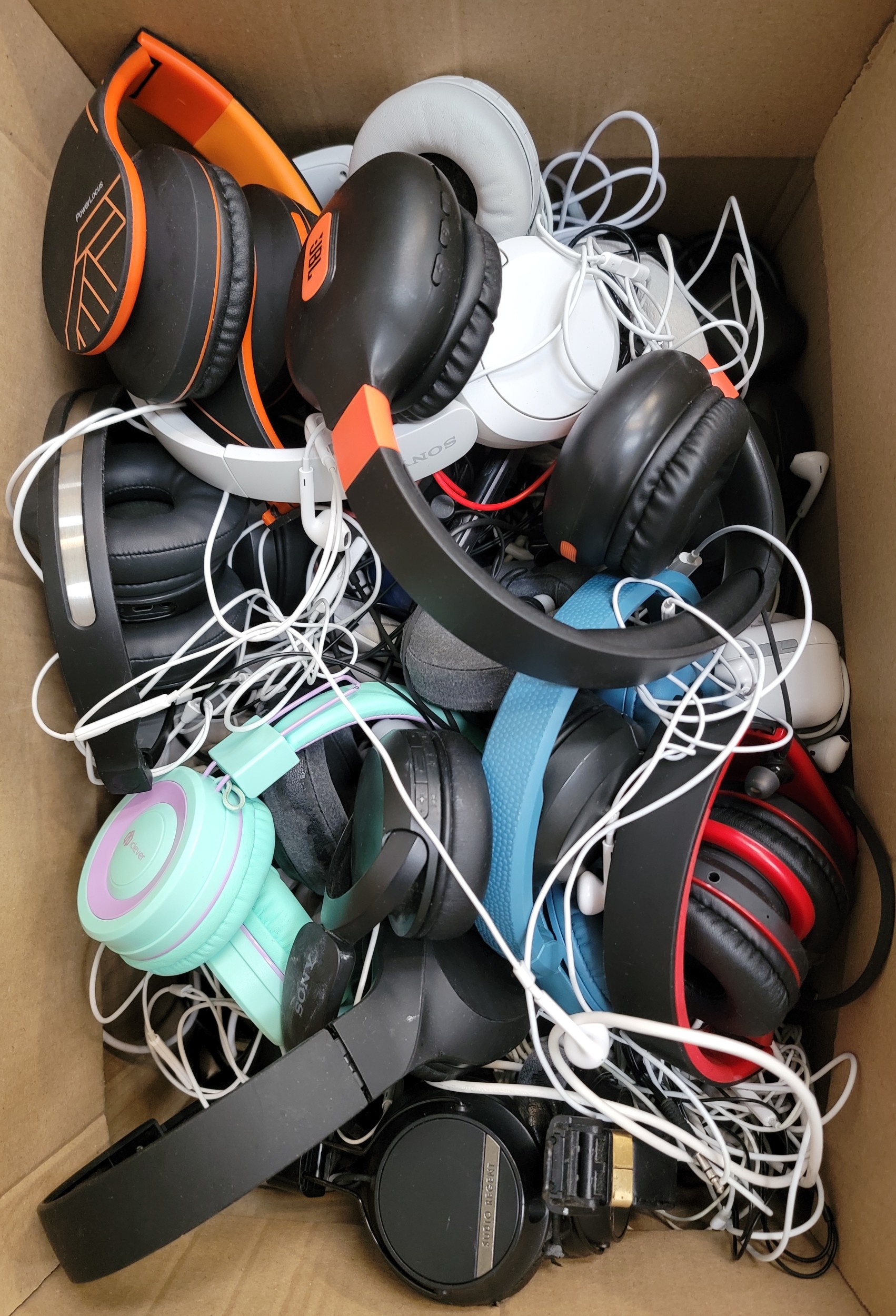 ONE BOX OF CABLES, CHARGERS AND HEADPHONESincluding Sony and JBL