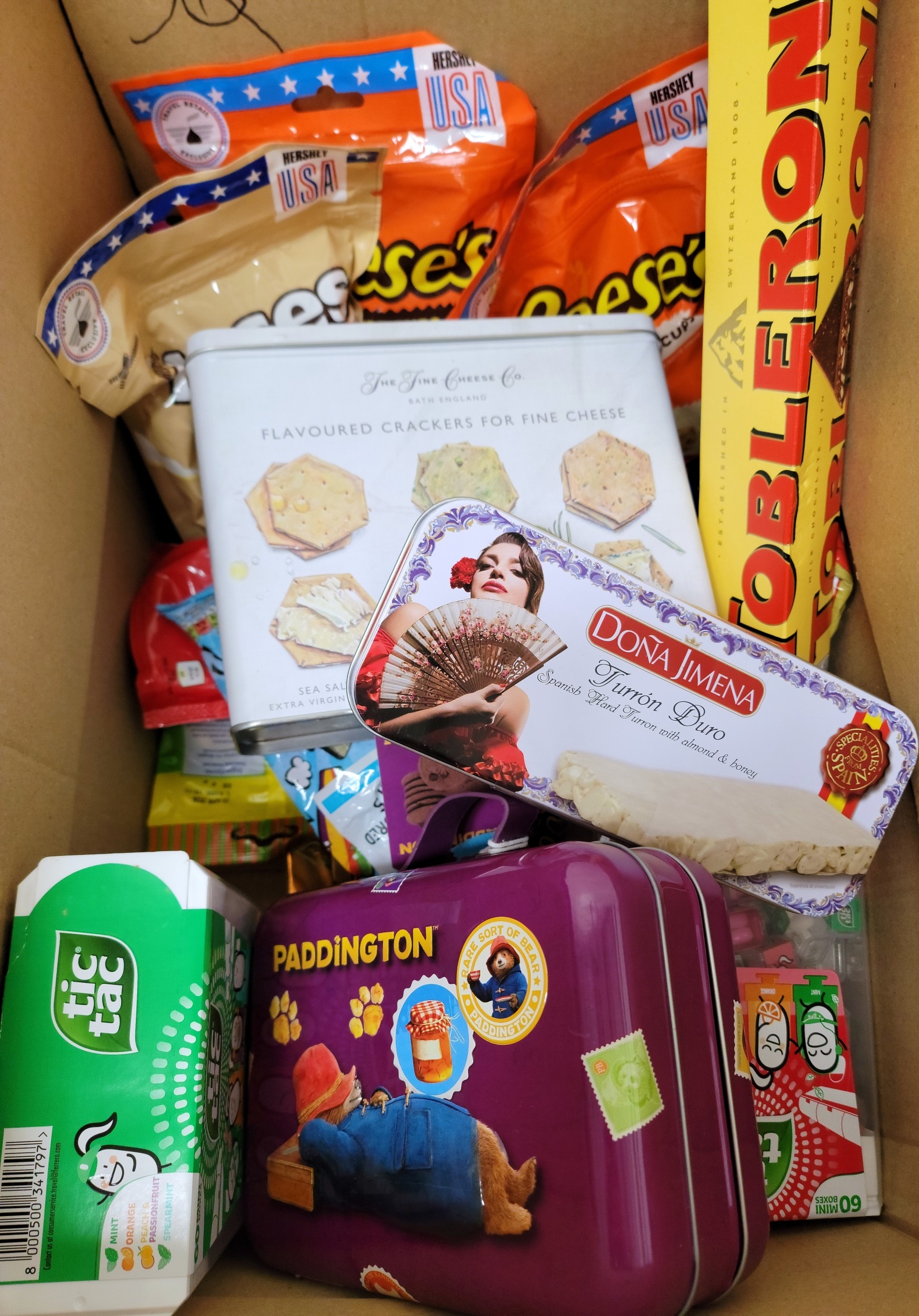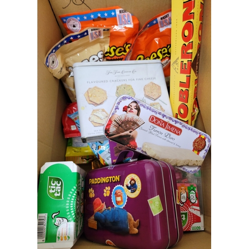 ONE BOX OF CONSUMABLE ITEMS including Toblerone, Reeces Pieces, Paddington cookies and Fine Cheese Co. crackers