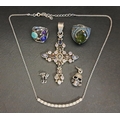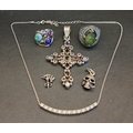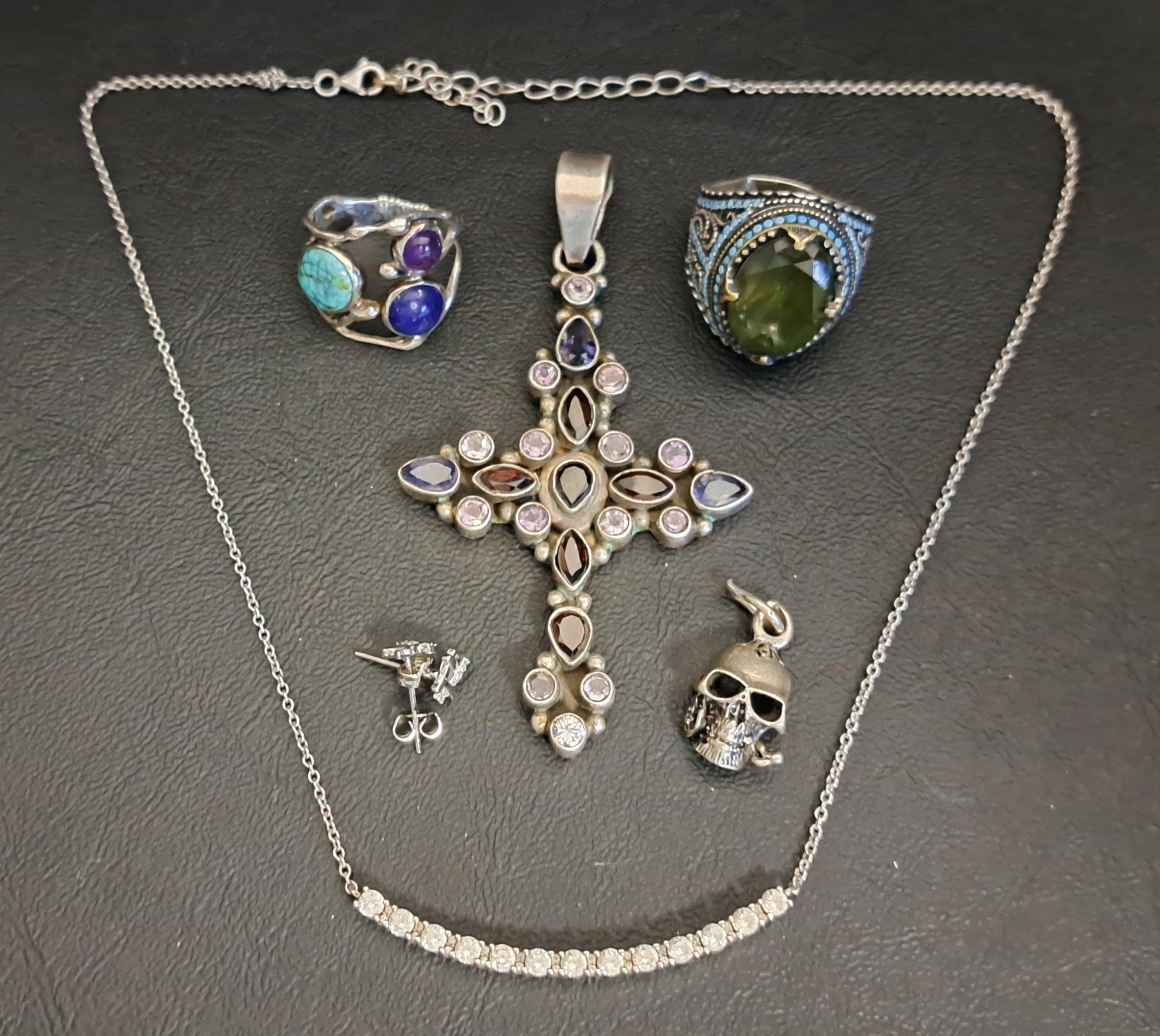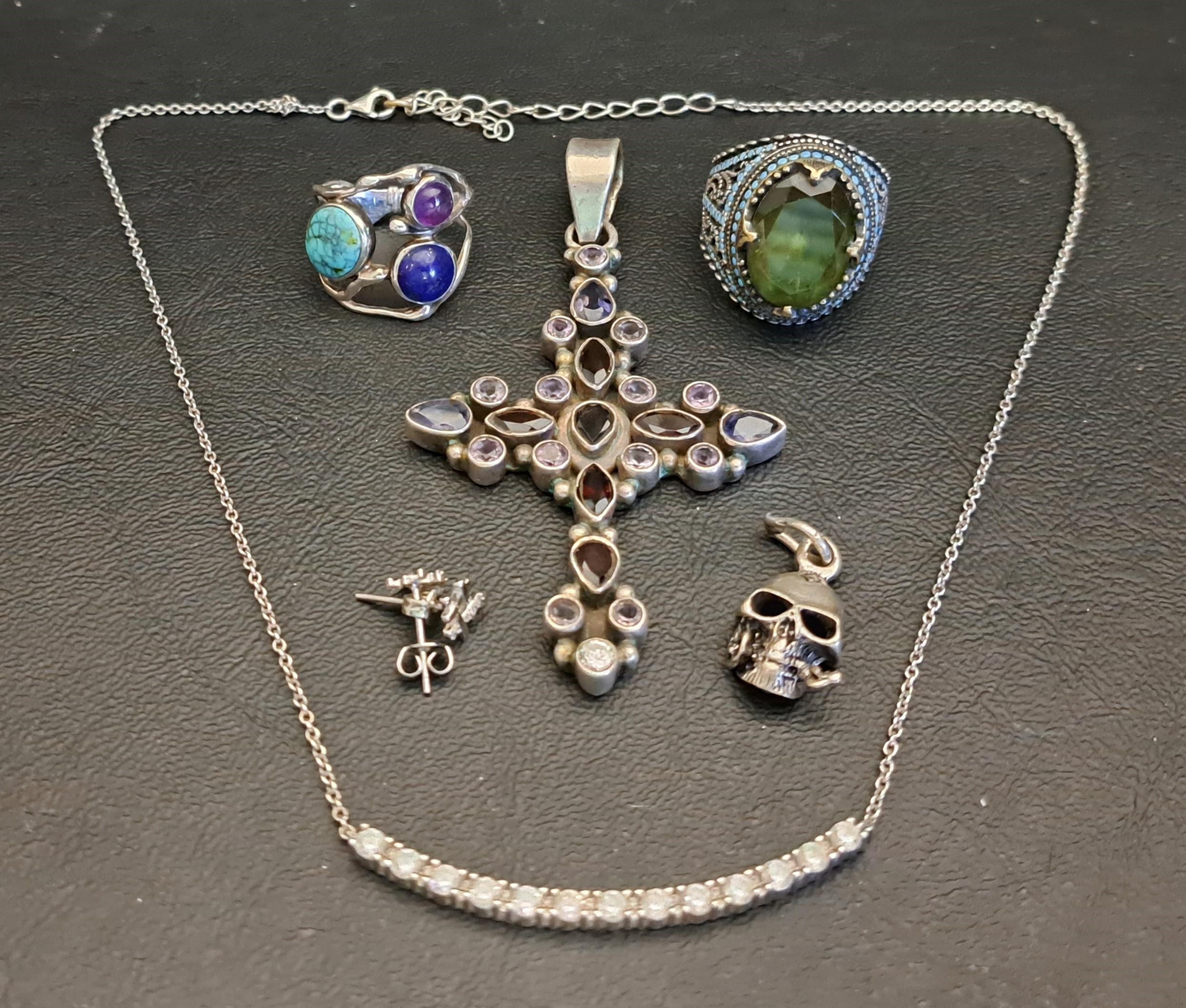 comprising a large amethyst and garnet set cross pendant, 8.4cm high; an amethyst, lapis and turquoise set ring; a CZ set necklace; a stone set dress ring; a skull pendant; and a pair of stud earrings