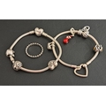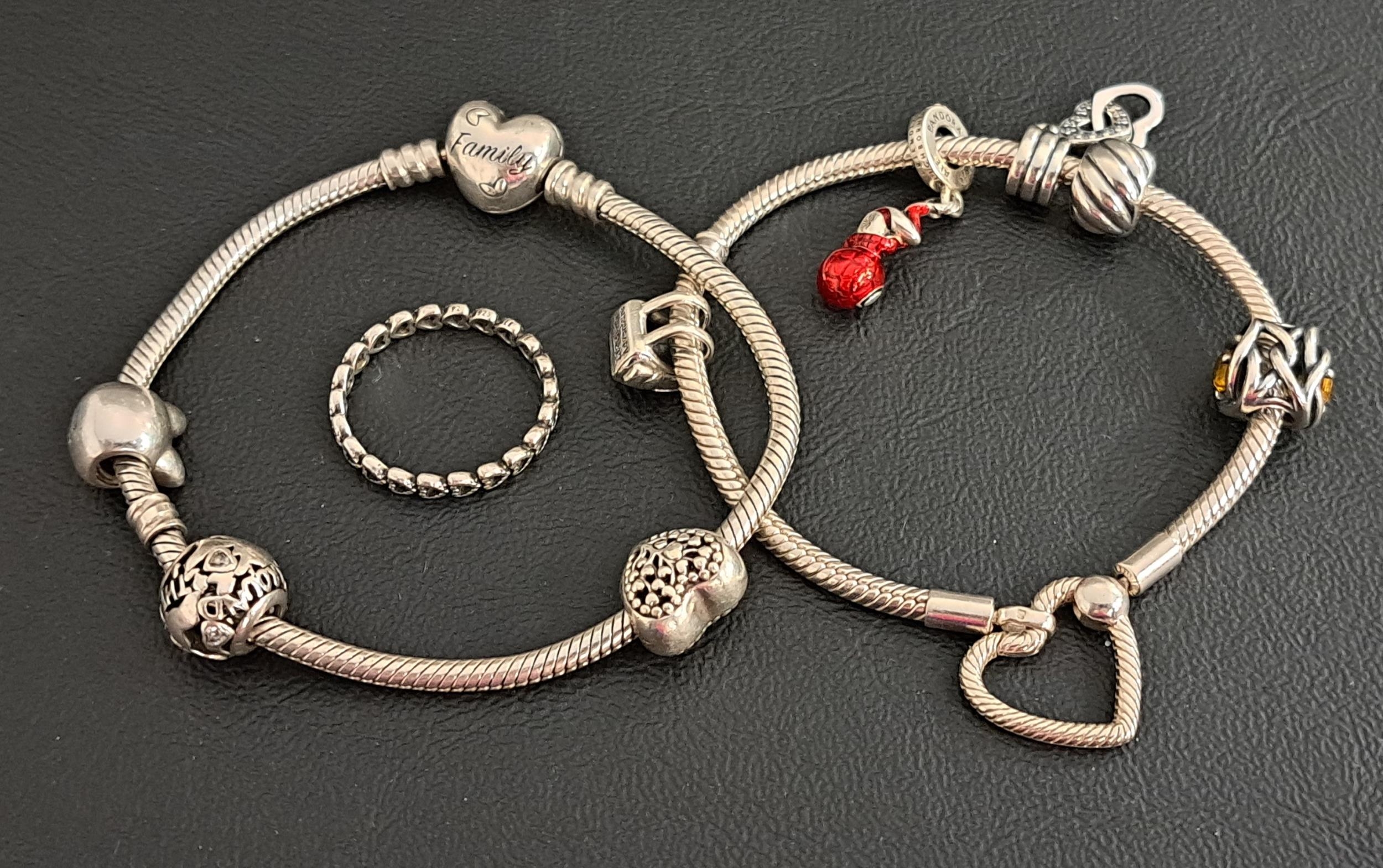 comprising a Family Tree Heart Clasp bracelet with three charms; and a Heart Closure bracelet with four charms and a clip; together with a Pandora silver Band of Hearts ring