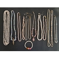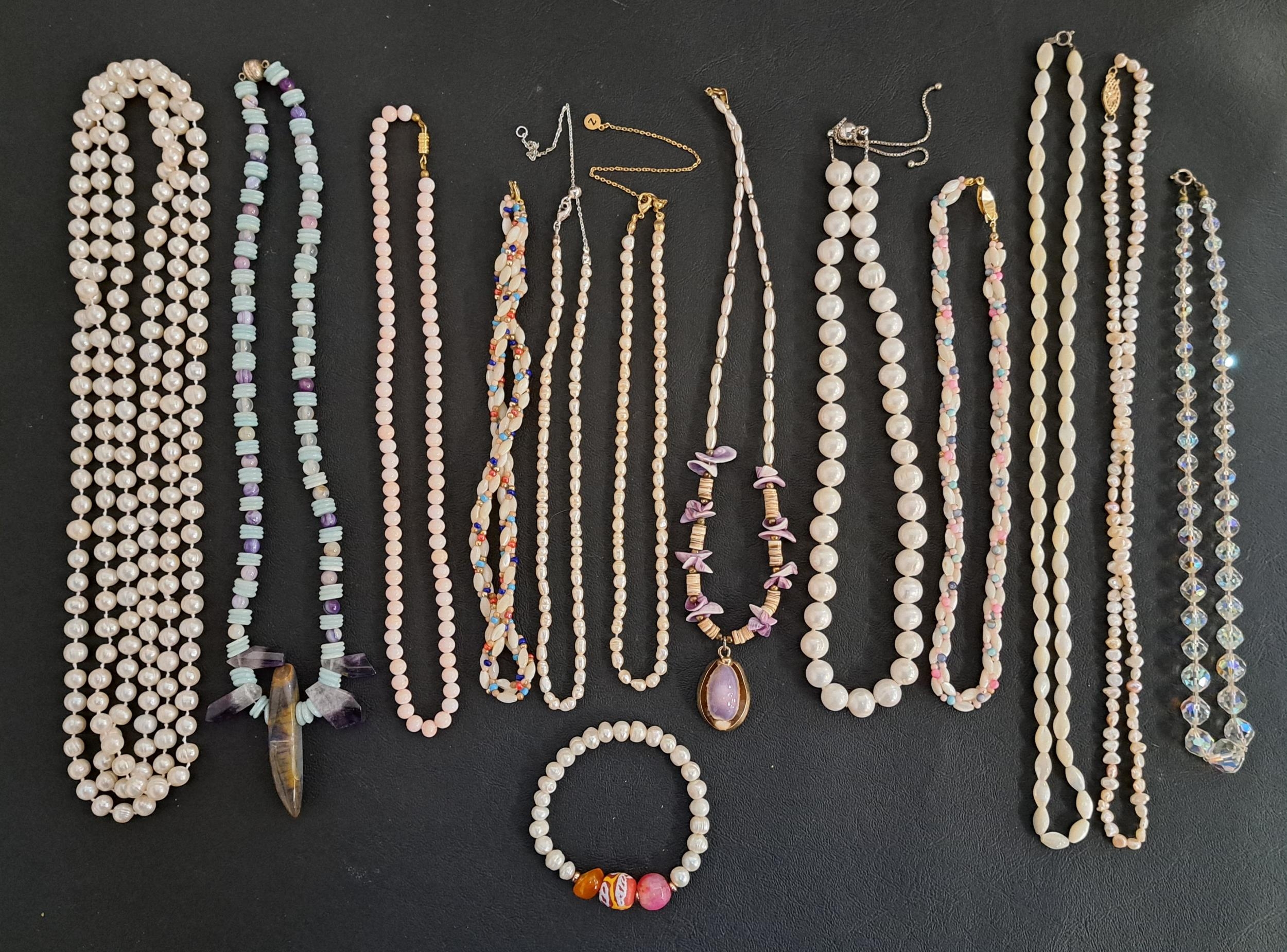 including one pearl necklace with fourteen carat gold clasp, crystal, angel coral, mother of pearl and stone/agate examples; and a pearl and glass bead bracelet (13)