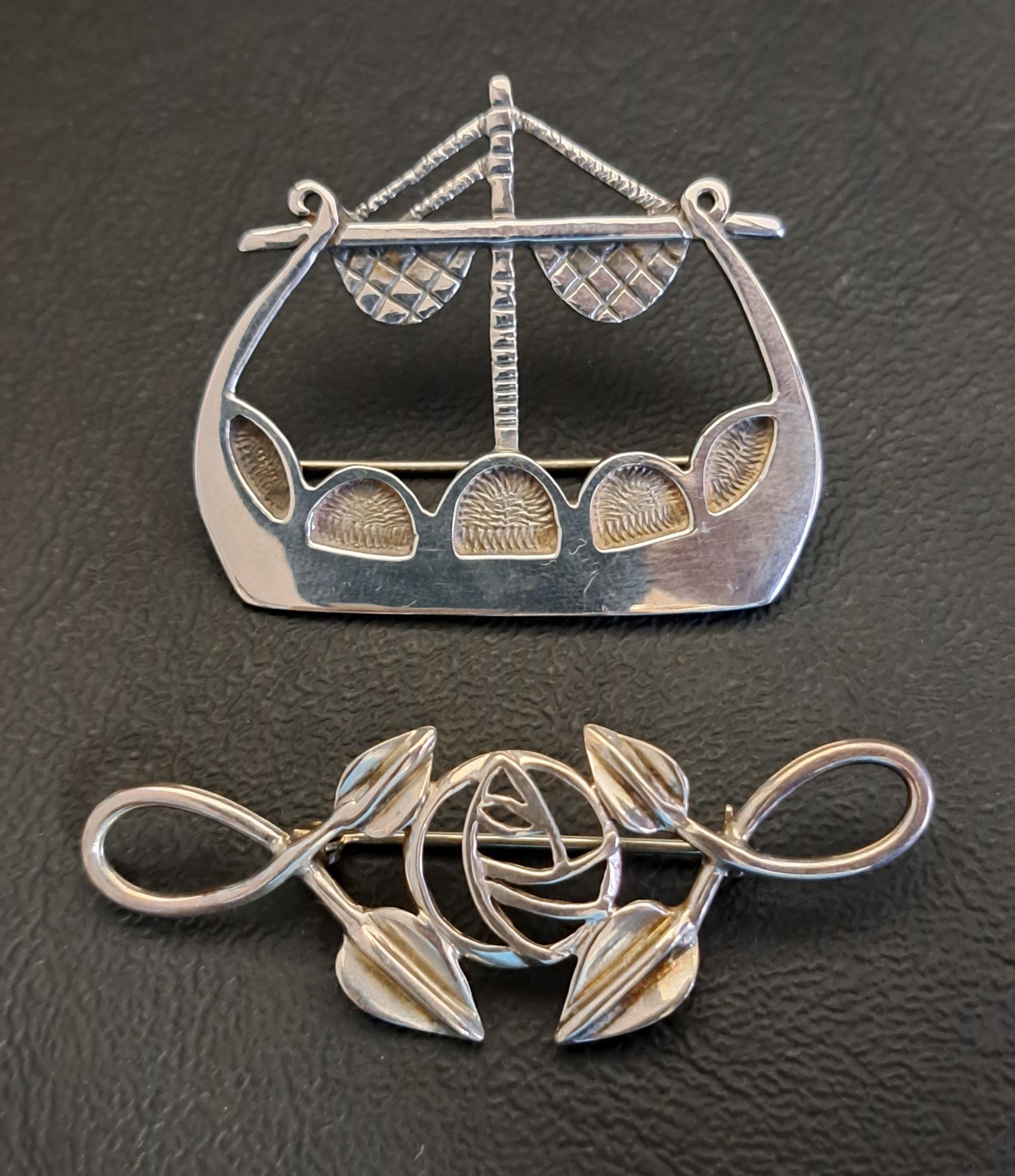 comprising an Ola Gorie brooch in the form of a Viking ship; and a Charles Rennie Mackintosh style brooch with Glasgow rose and motif decoration (2)
